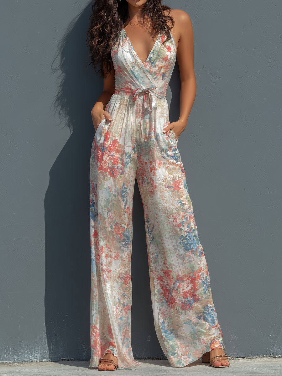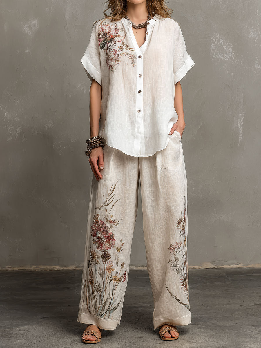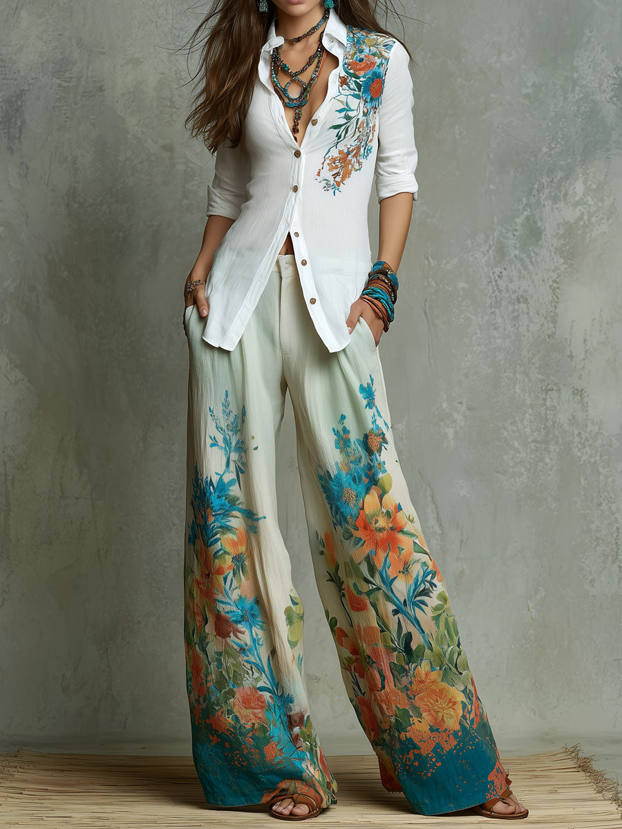 Satin Floral Button-Down Shirt With Leopard Trim