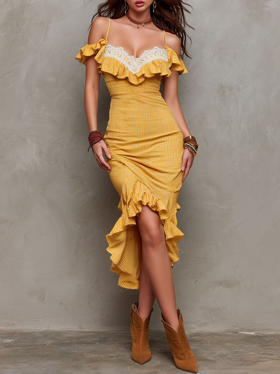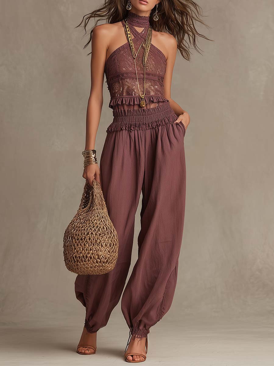 Dusty Mauve Lace-Trim Ruched Midi Dress