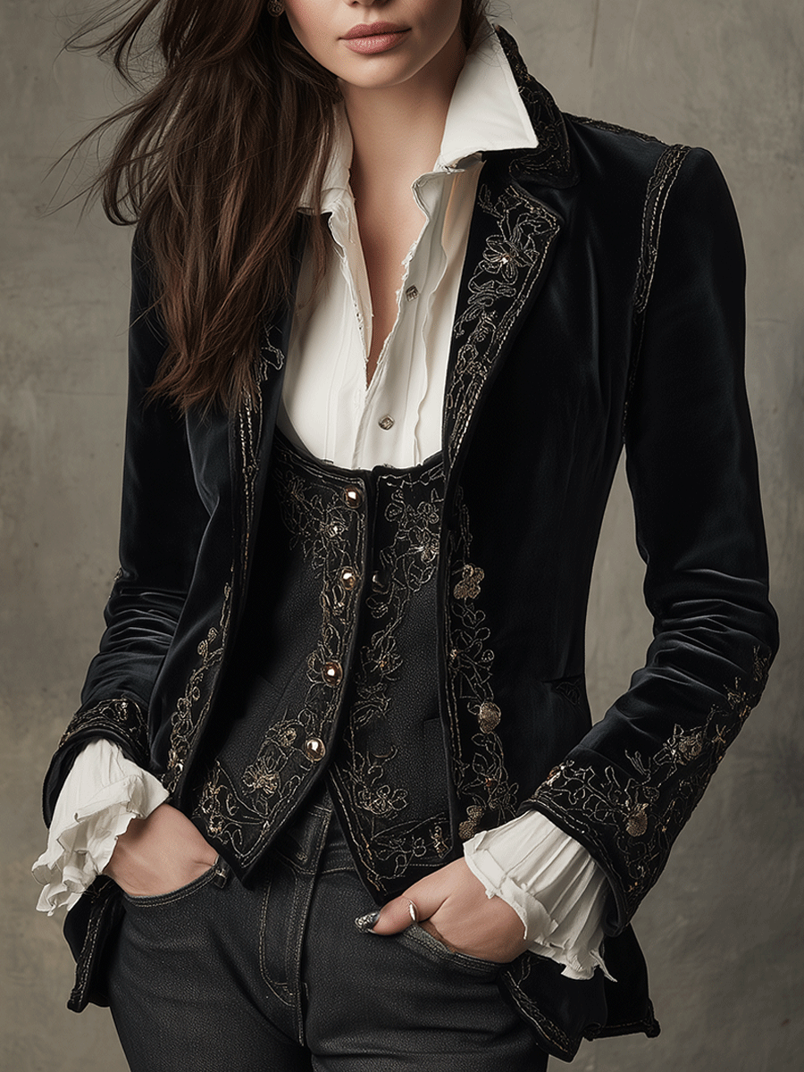 This blazer is an exquisite piece crafted from luxurious black velvet, adorned with intricate embroidery that adds a touch of sophistication. The deep black color provides a timeless elegance, making it a versatile addition to any wardrobe.
