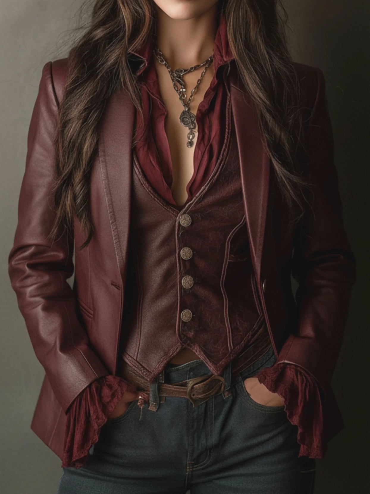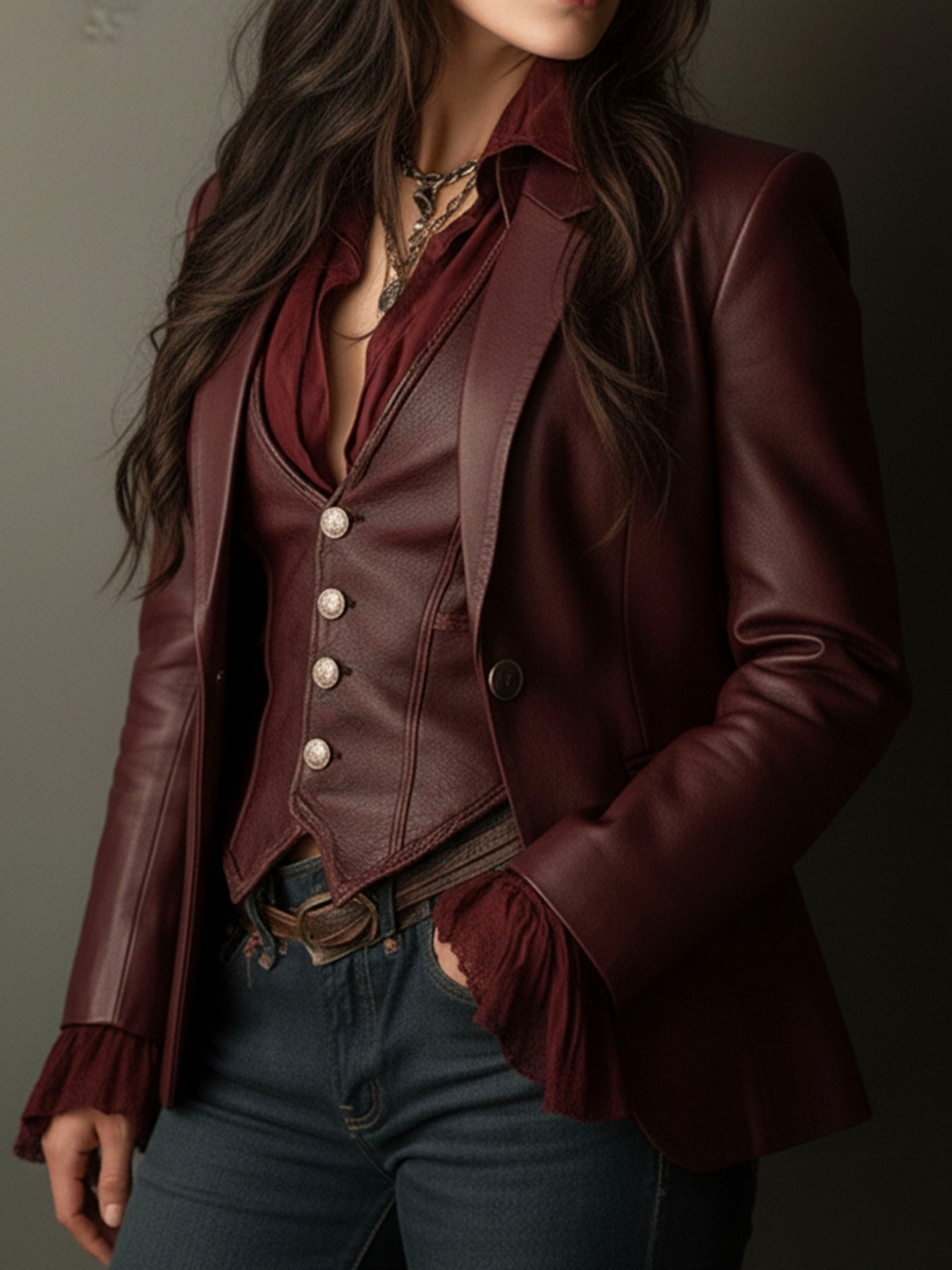 This Vintage Burgundy Eco Leather Blazer can be effortlessly styled for various occasions. For a professional look, pair it with a crisp white blouse, tailored black trousers, and classic pumps. For a casual outing, style it with a simple t-shirt, distressed jeans, and ankle boots. Add a statement necklace or a silk scarf for a touch of personal flair.