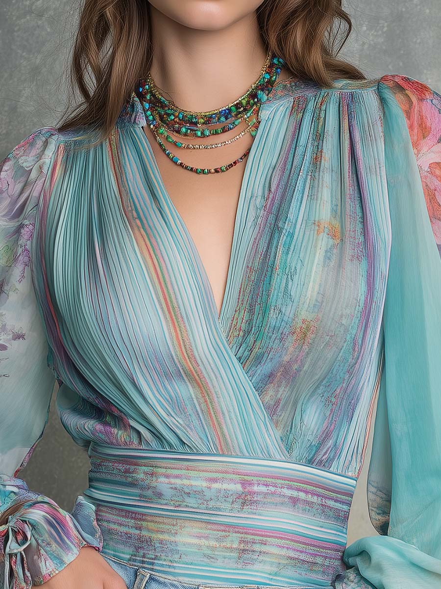 Bohemian Vintage Pleated Chiffon Wrap Blouse