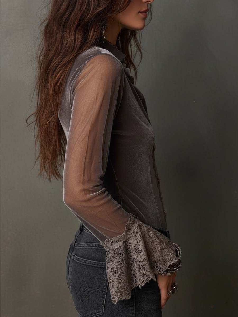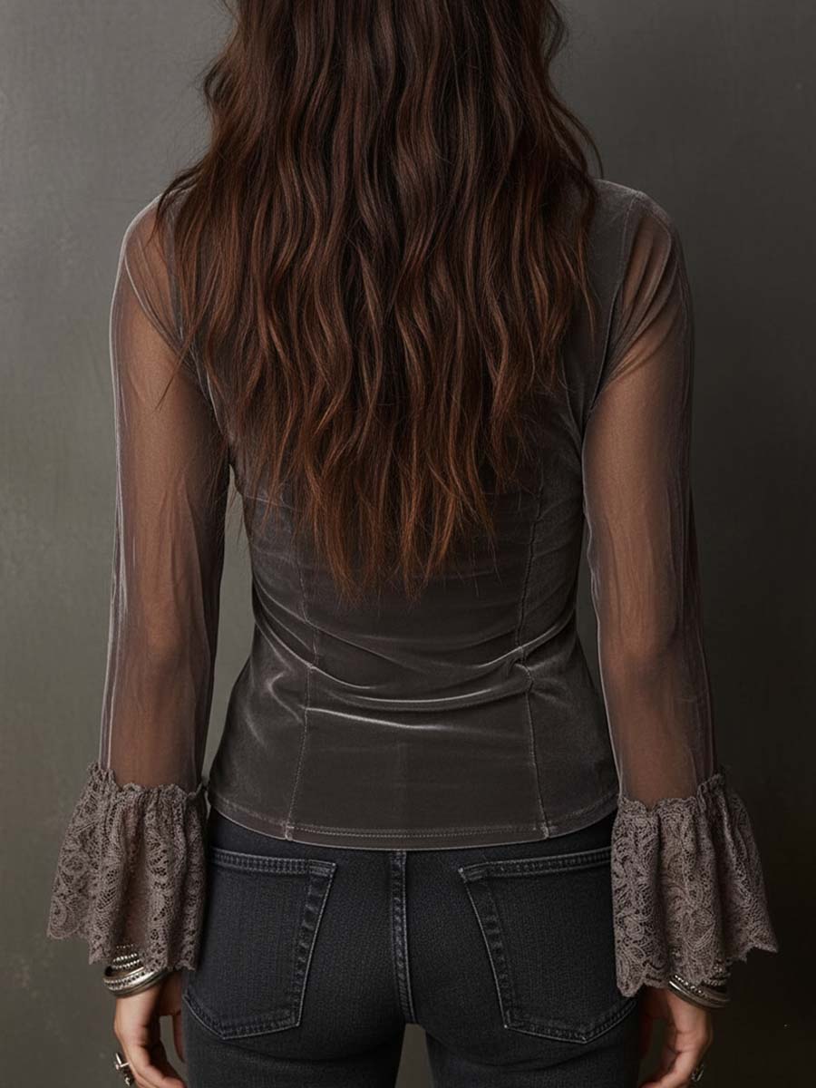 Vintage Polyester Velvet Sheer Sleeves Lace Trim Blouse