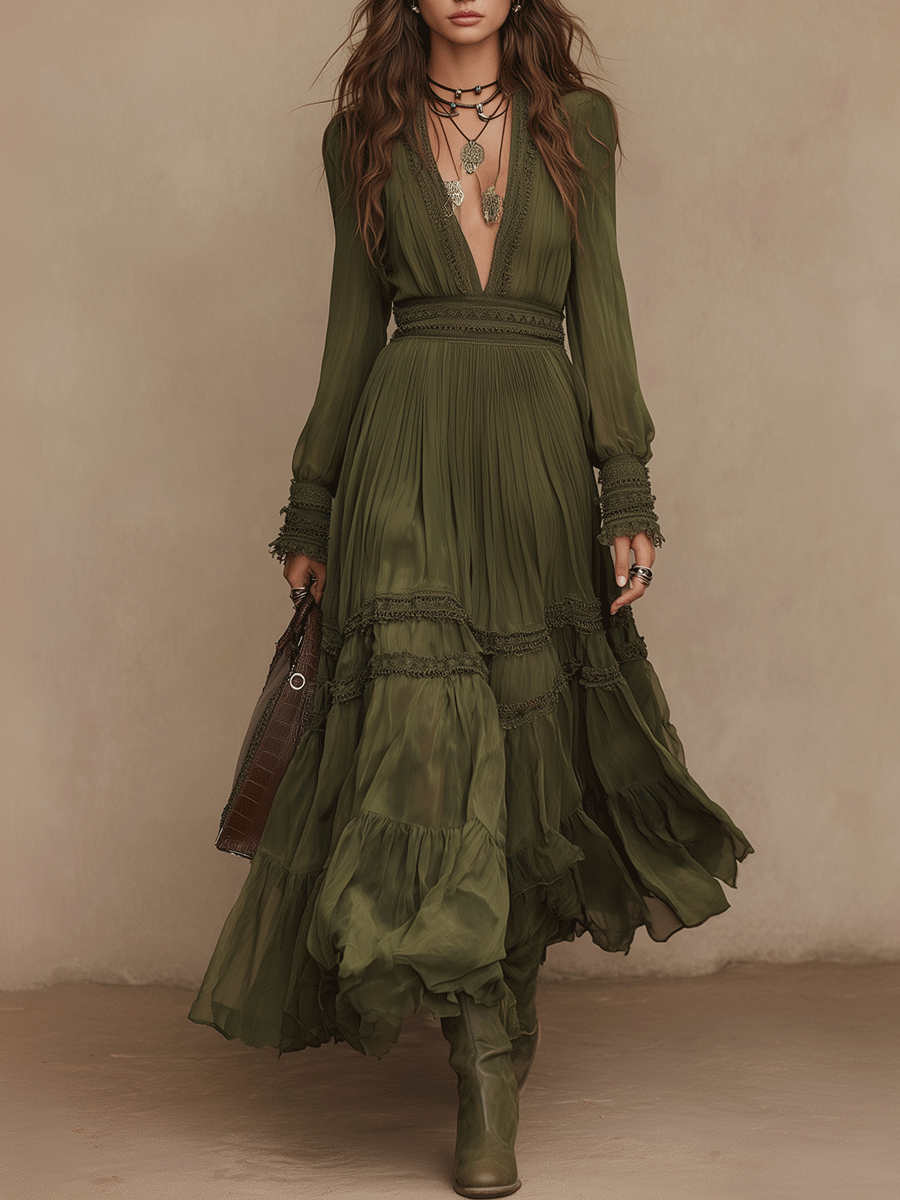 Bohemian Olive Pleated Flowing Tiers Maxi Dress