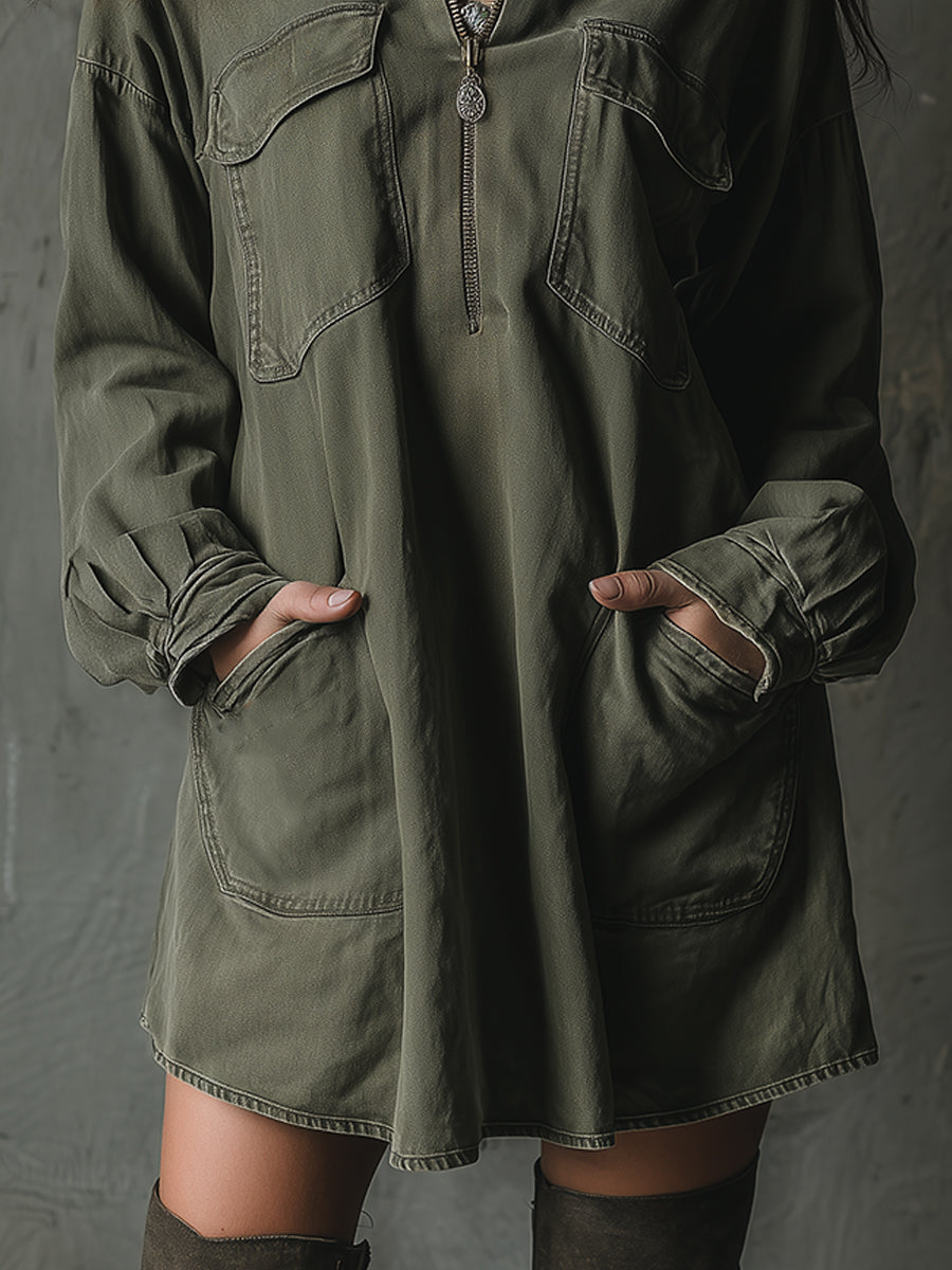 Bohemian Washed Half-zip Loose Denim Mini Dress