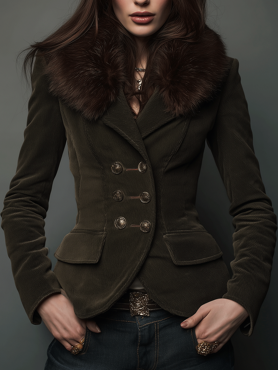 • Elegant fur trim that enhances the jacket's vintage aesthetic and adds warmth.