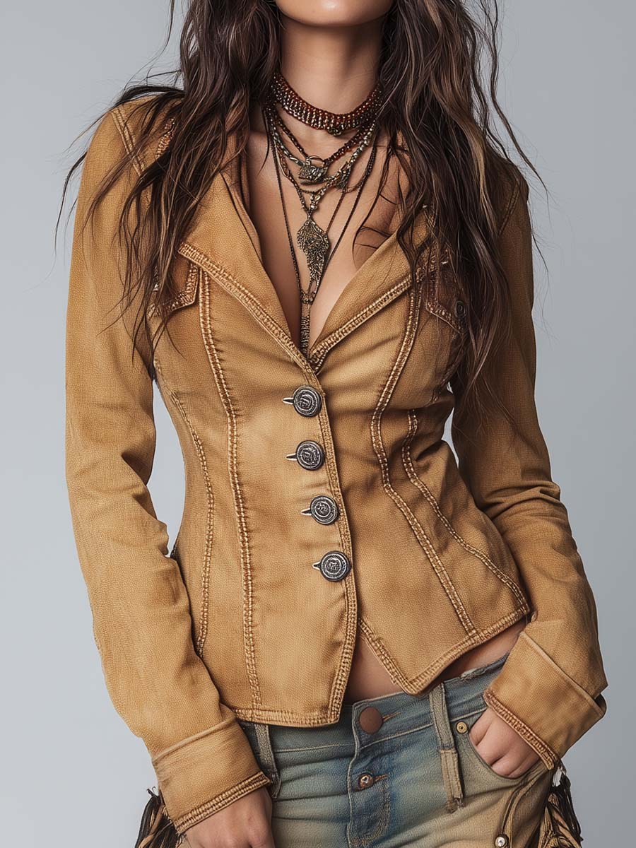 Retro Stand Collar Metal Button Pu Jacket