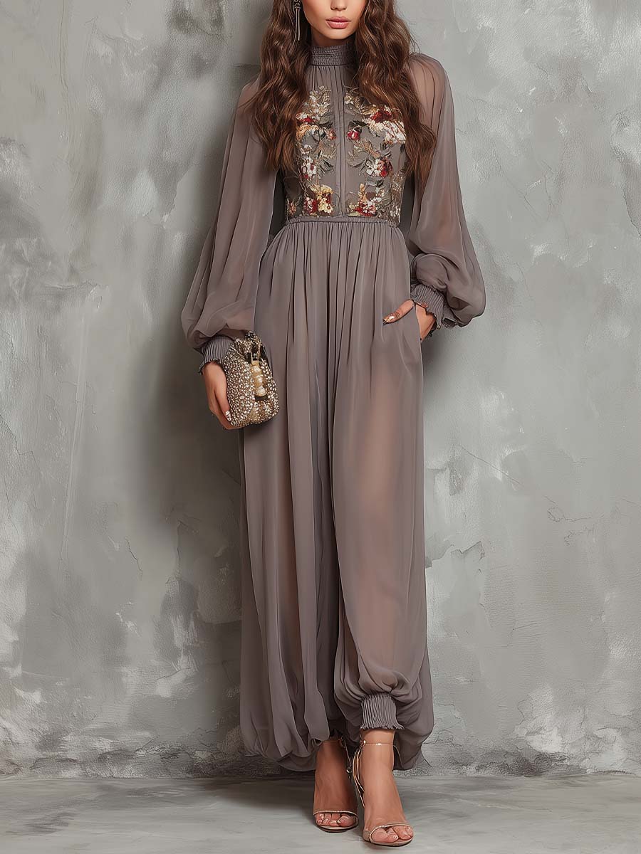 Embroidered Chiffon High-Neck Balloon-Sleeve Jumpsuit