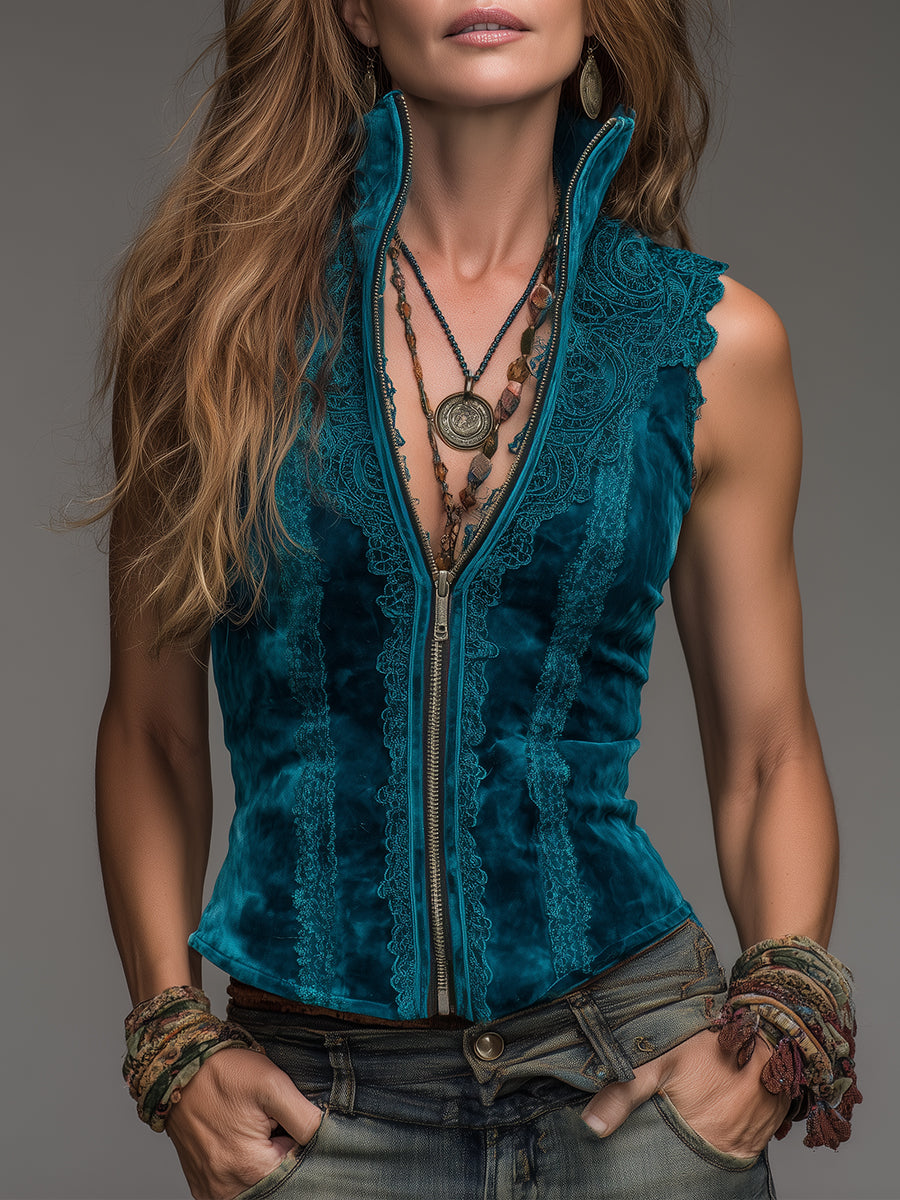 This Bohemian Style Stand-collar Vest is a unique fashion statement, featuring a striking front zipper and delicate lace trim. The vest showcases a modern take on bohemian trends with its intricate detailing and sophisticated design.