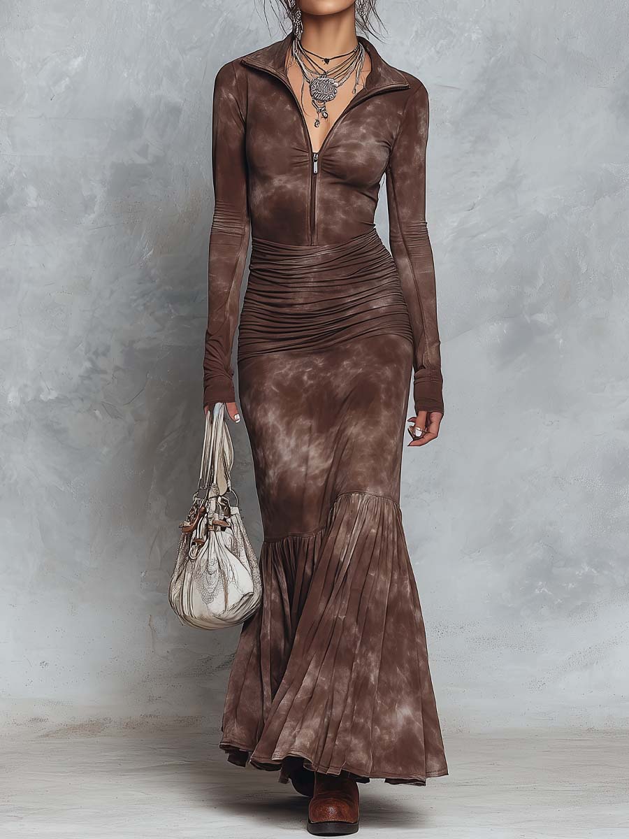This Vintage-style Distressed Zipper Collar Pleated Waist Maxi Dress is a fusion of timeless appeal and modern design elements. Its flexible styling options make it an ideal choice for various occasions, ensuring you look effortlessly elegant every time you wear it.
