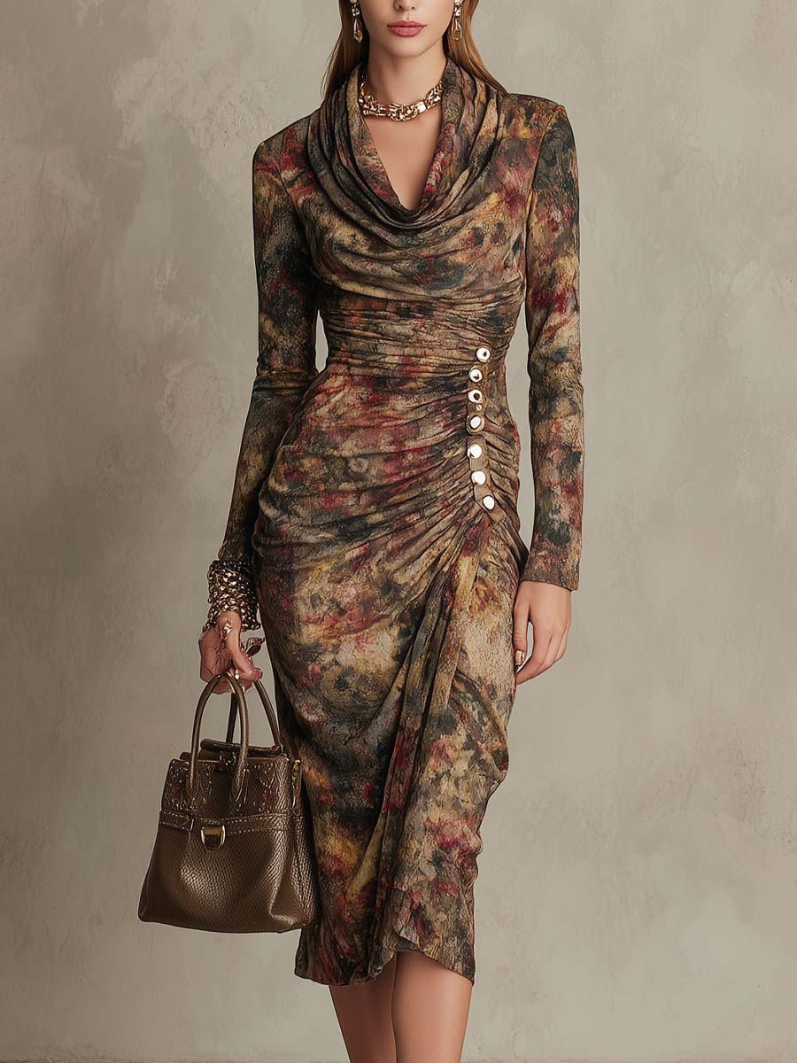 Vintage Floral Cowl Neck Metal Button Waist Midi Dress