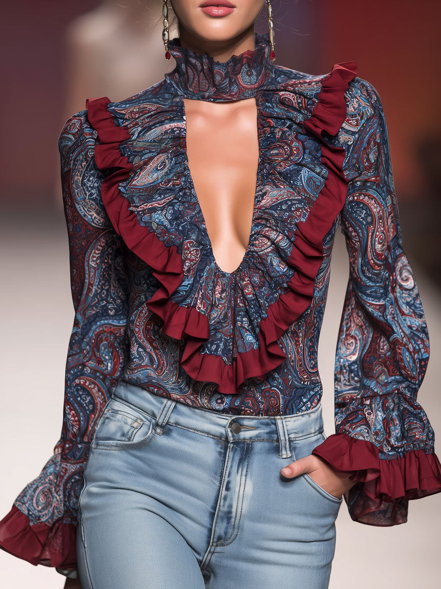 Romantic Boh Deep V-Neck Paisley Ruffled Chiffon Blouse