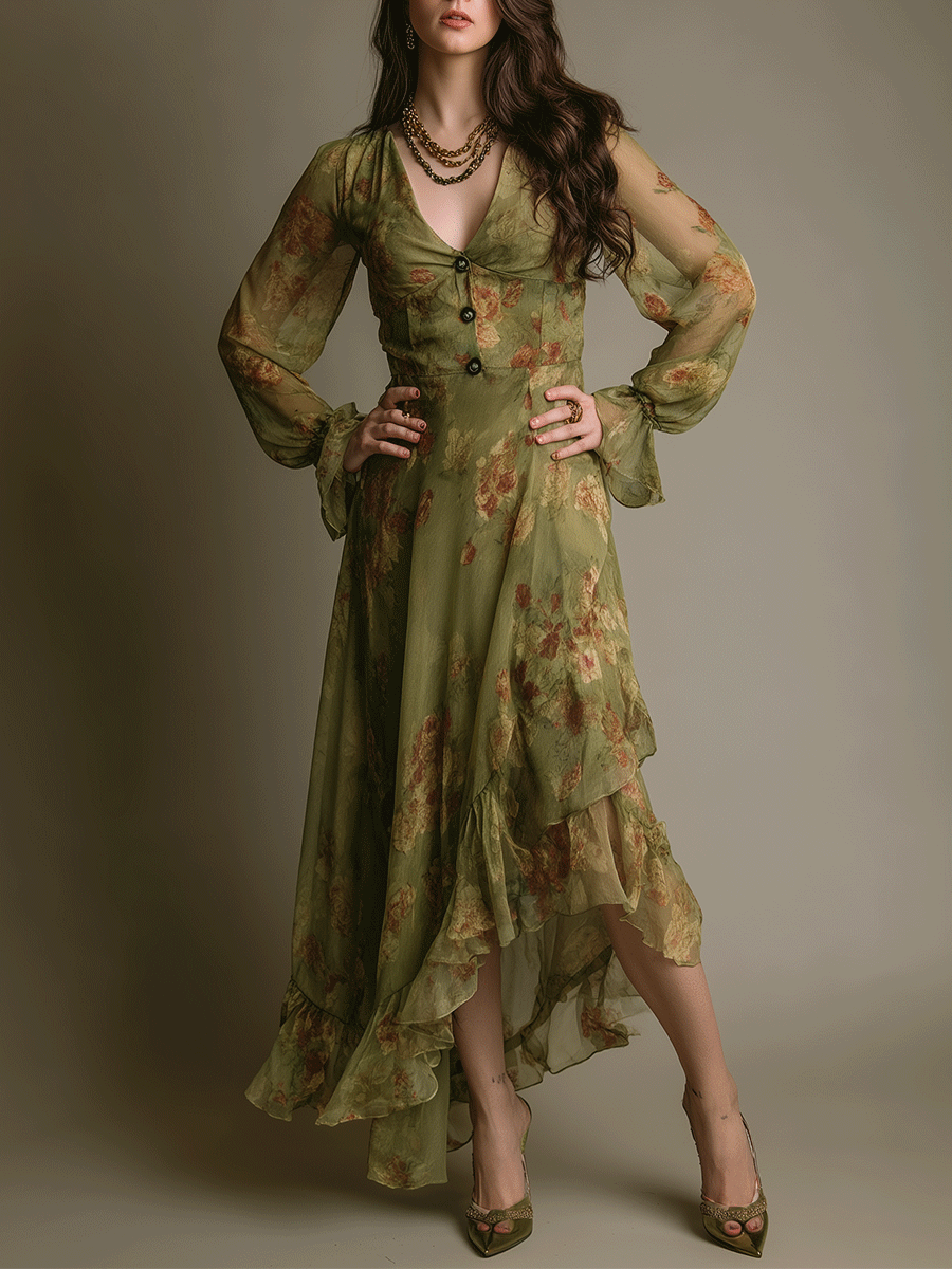 The Vintage Romantic Boho Green Ruffle Hem Maxi Dress exudes elegance and charm with its flowing silhouette and intricate detailing. This dress is designed to capture the essence of bohemian style with a romantic vintage twist, making it the perfect choice for those who appreciate a blend of retro and modern aesthetics.