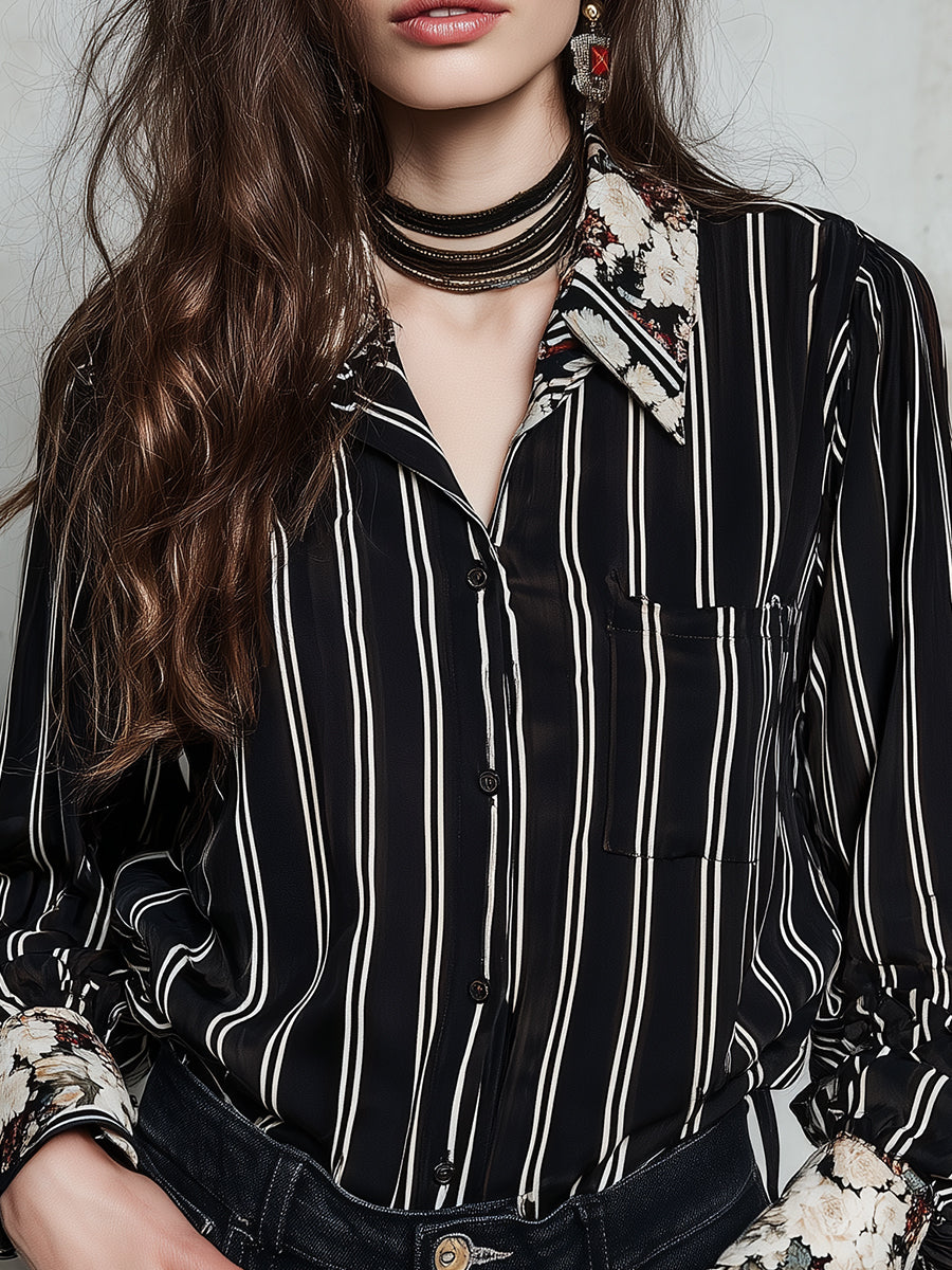This Retro Striped Oil Painting Floral Satin Blouse offers a refined mix of vintage stripes and artistic florals on a lustrous satin base. It’s an easy-to-wear piece that elevates both casual and dressier outfits, perfect for anyone seeking a statement blouse with timeless versatility.