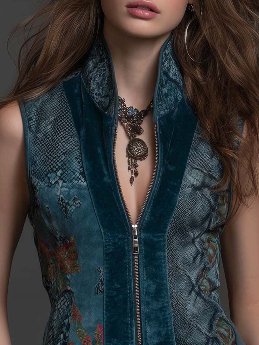 This sleeveless vest top is crafted with a polyester velvet front panel, paired with vintage-inspired printed woven side panels, creating a rich contrast in texture and depth. The velvet surface adds softness and a subtle sheen, while the printed panels bring visual complexity and a handcrafted, artisanal feel.