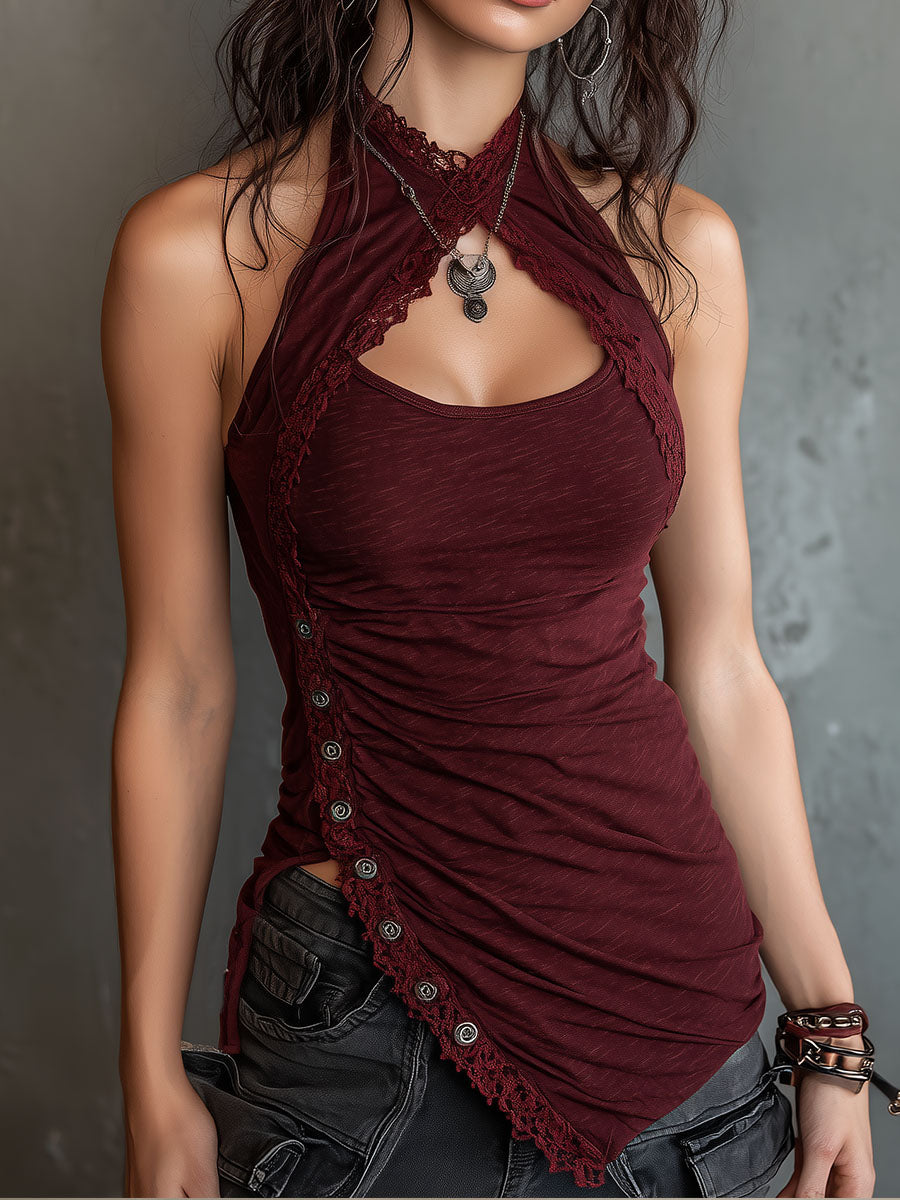 Asymmetric Button Burgundy Lace Halter Tank Top