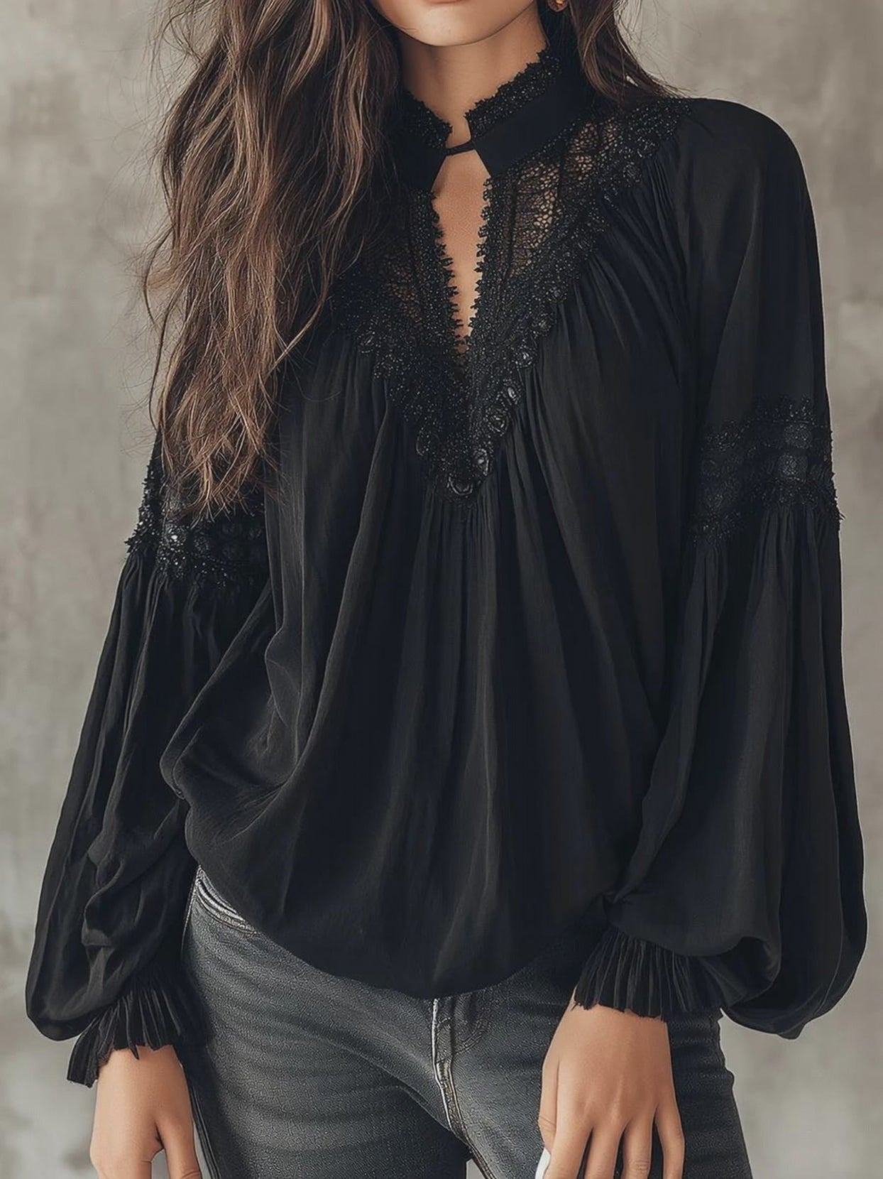 Black Lace Blouse – Vintage Boho Long-Sleeve Top With V-Neck And Puff Sleeves