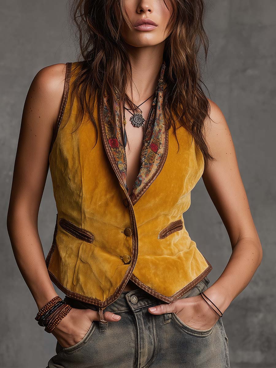 This vintage-inspired vest is crafted from soft polyester velvet in a rich golden mustard tone, bringing warmth and depth to your fall wardrobe. The standout detail lies in the printed contrast lapel—featuring tapestry-style florals and muted earthy tones that add a touch of bohemian artistry. Trimmed with distressed brown edging and finished with antique-style buttons, the vest offers a sculpted yet relaxed silhouette, perfect for layering with denim or flowy blouses. A statement piece that blends retro charm with modern versatility.