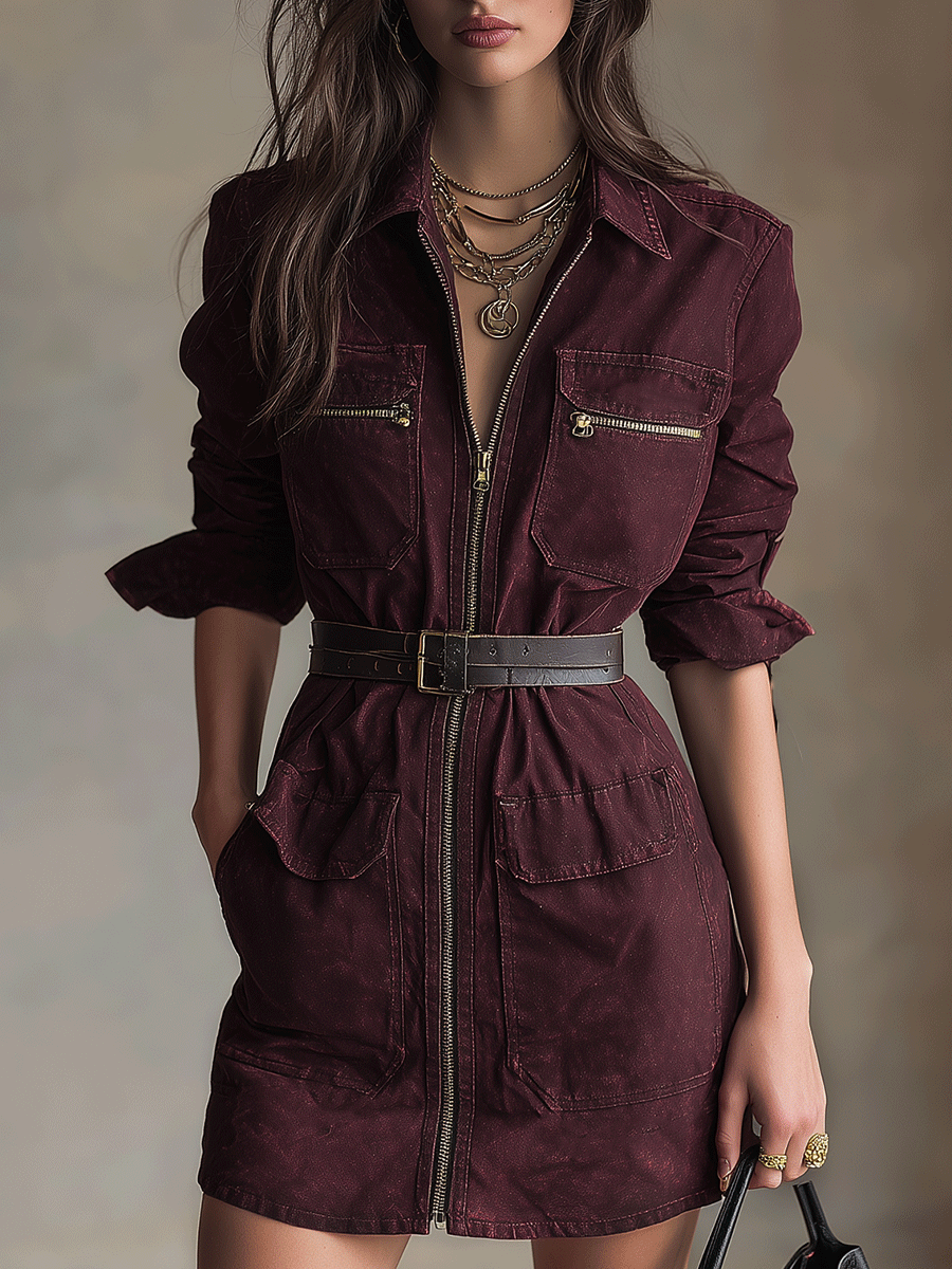 SummaryCombining vintage vibes with a functional design, the Vintage Burgundy Zip-Front Utility Mini Dress is a versatile piece that can seamlessly transition from day to night, making it a must-have in your fashion collection. |