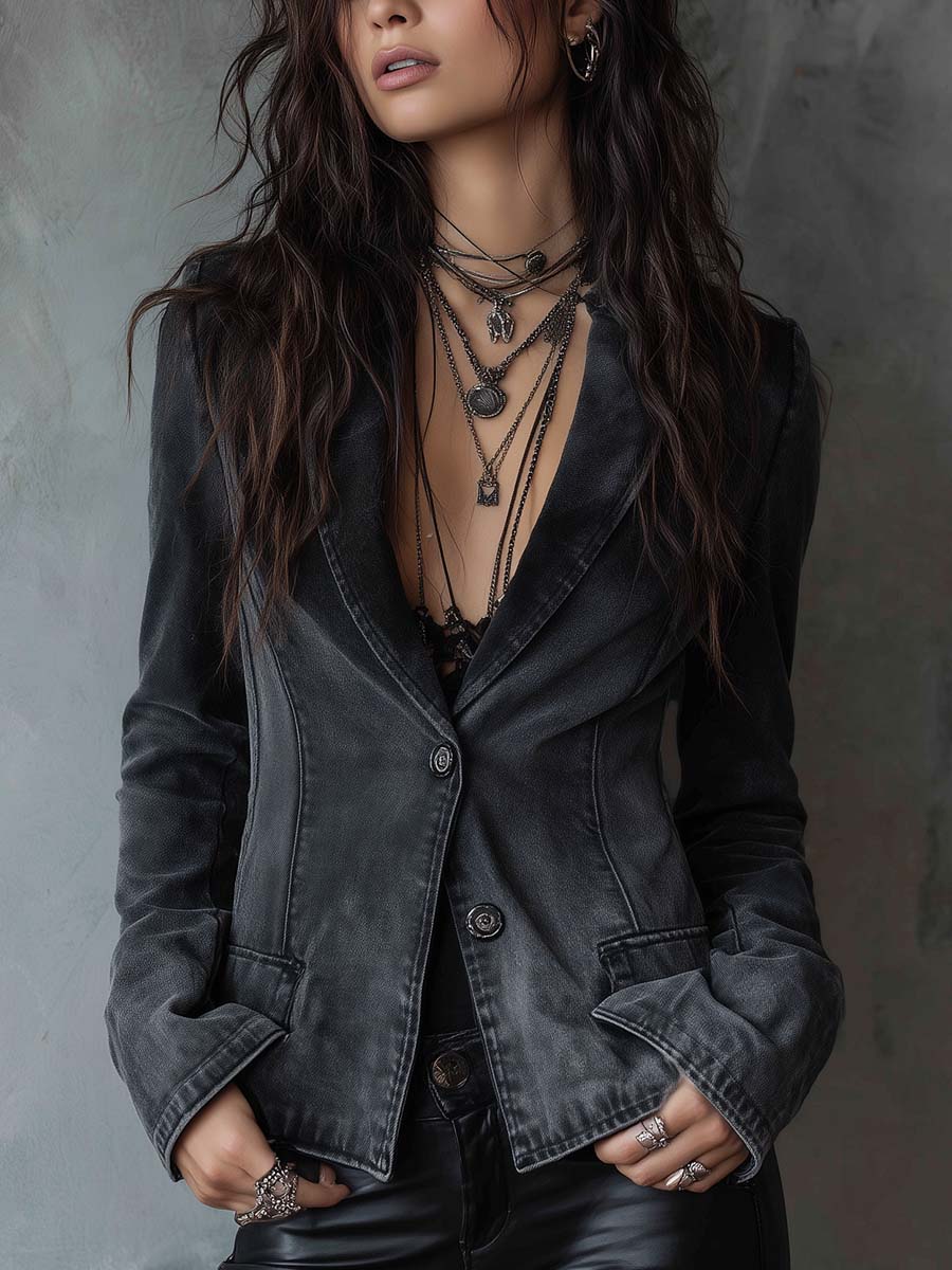 A statement blazer crafted in a washed-black finish that blends the attitude of denim with the structure of tailored outerwear. Designed with a sculpted waist, sharp lapels, and subtle fading that adds depth without looking distressed. The soft hand-feel fabric and precision seaming create a refined silhouette that moves effortlessly from casual layering to evening styling. Perfect for women who love modern vintage, rock-boho influences, and clean, confident lines.