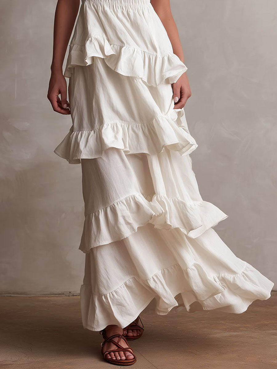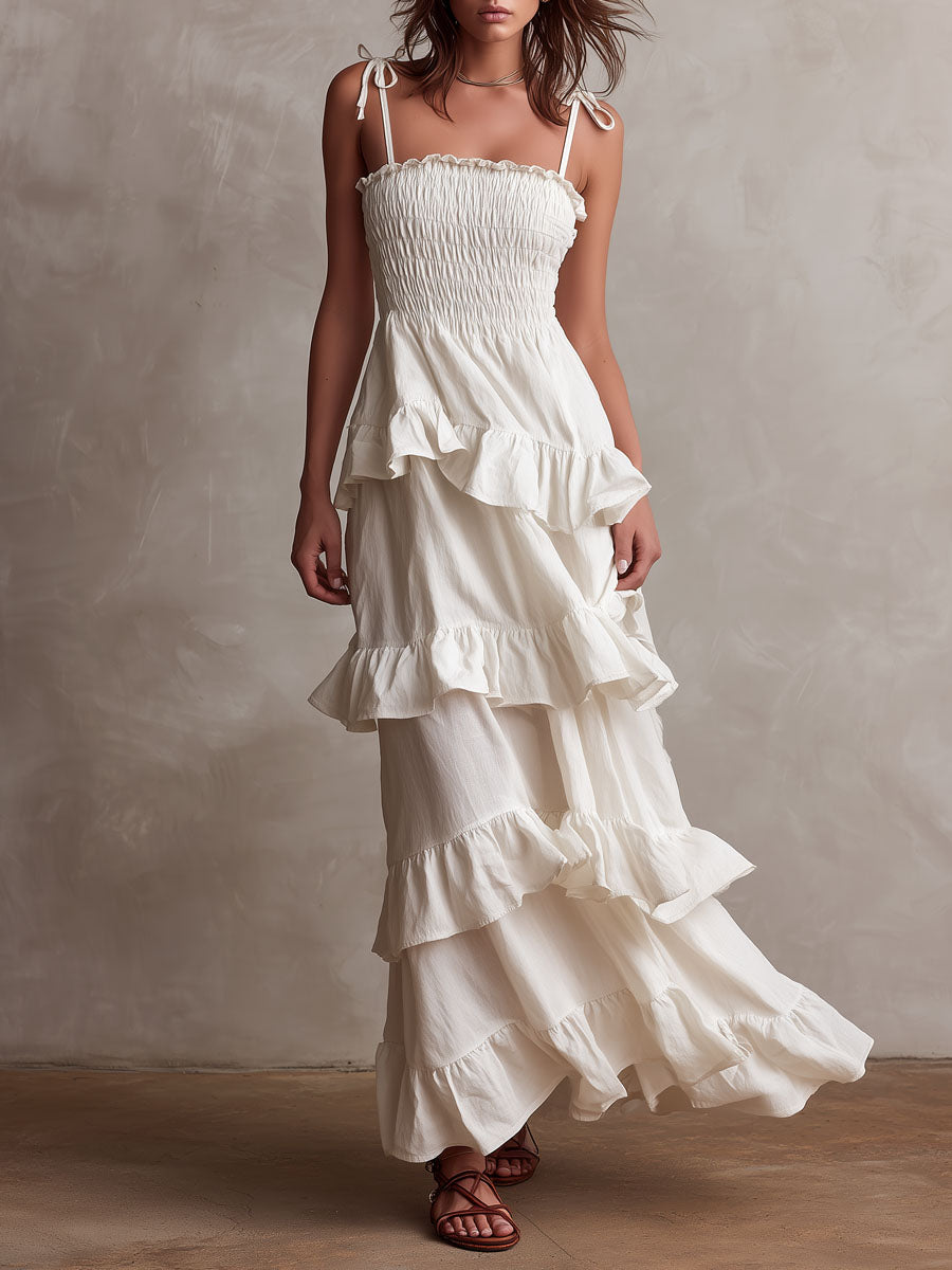 Boho White Linen-Blend Smocked Ruffle Maxi Dress