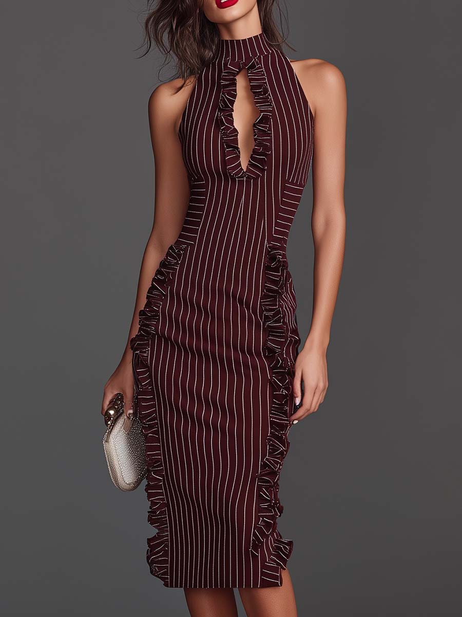 This burgundy pinstripe midi dress blends sharp tailoring with feminine movement. Designed with a halter neckline and subtle front cutout framed by soft ruffles, it balances structure with statement detail.