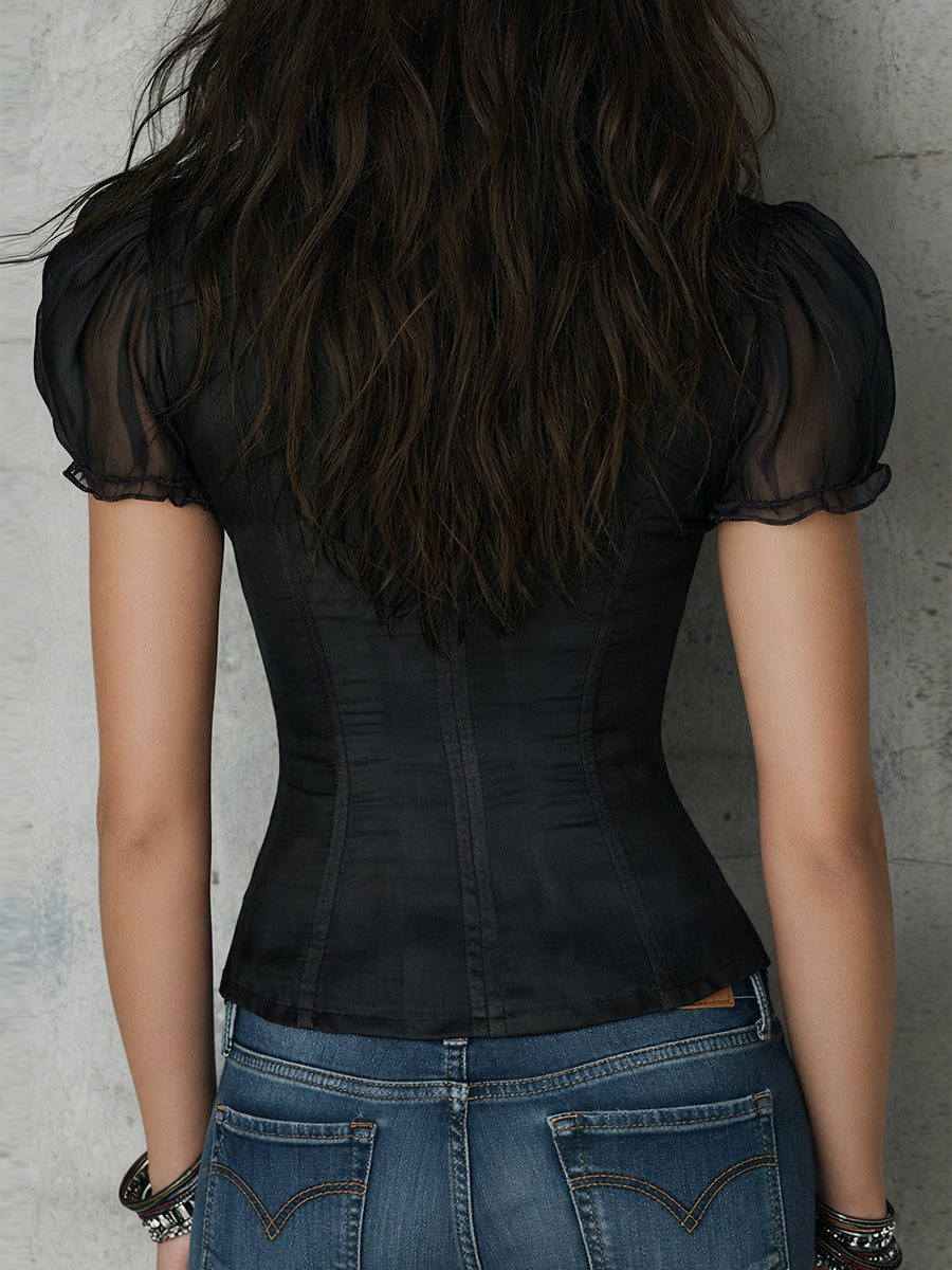Retro Ruffled Neckline Satin Slim-fit Chiffon Short-sleeved Blouse
