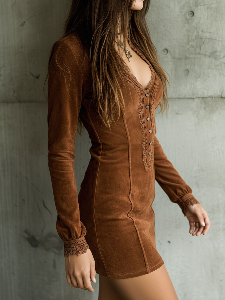 Vintage Keyhole Neck Lace Sleeves Velvet Mini Dress