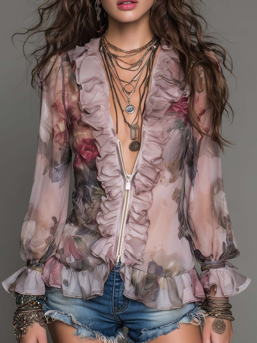 This dusty rose floral blouse blends romantic softness with effortless edge. The semi-sheer chiffon fabric flows naturally, while cascading ruffle trim along the neckline and front zipper adds dimension and movement.