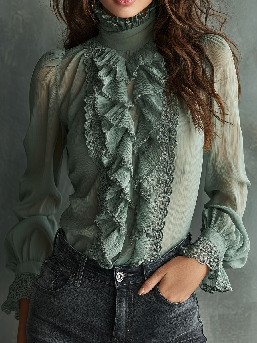 Retro Elegant Sage Green Pleated Chiffon Ruffle Lace Blouse