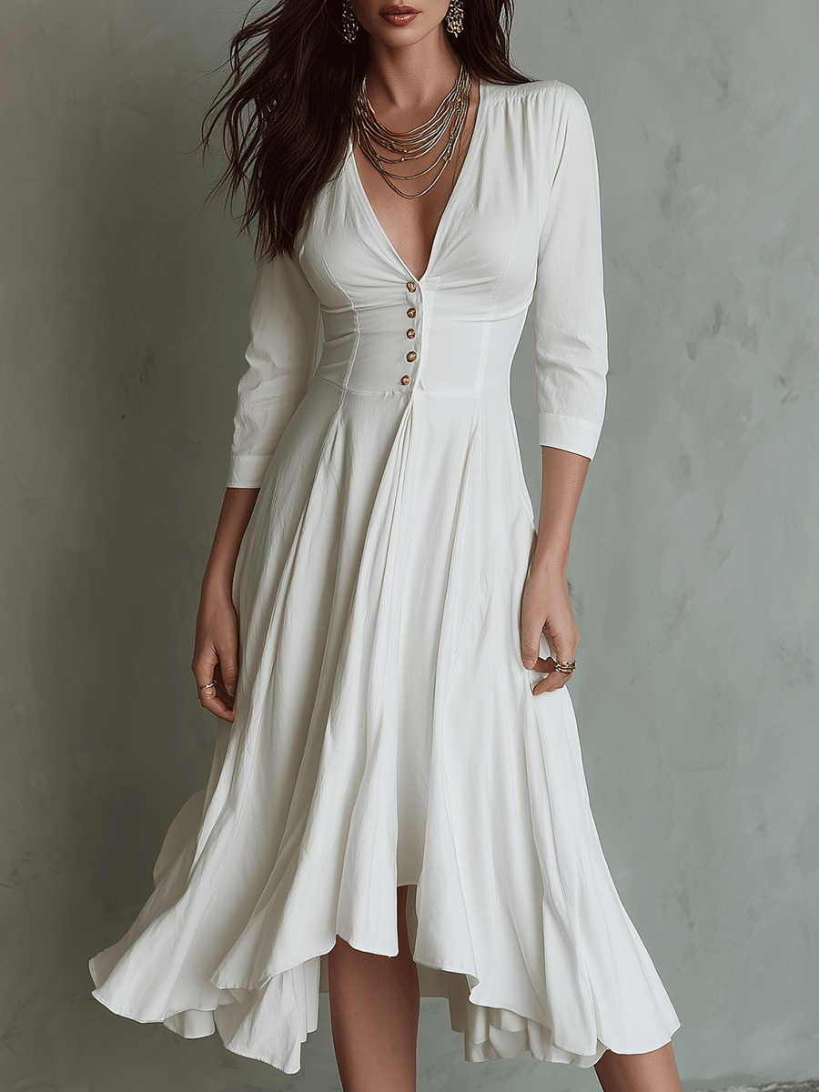 Elegance V-Neck Timeless Ivory Button Midi Dress