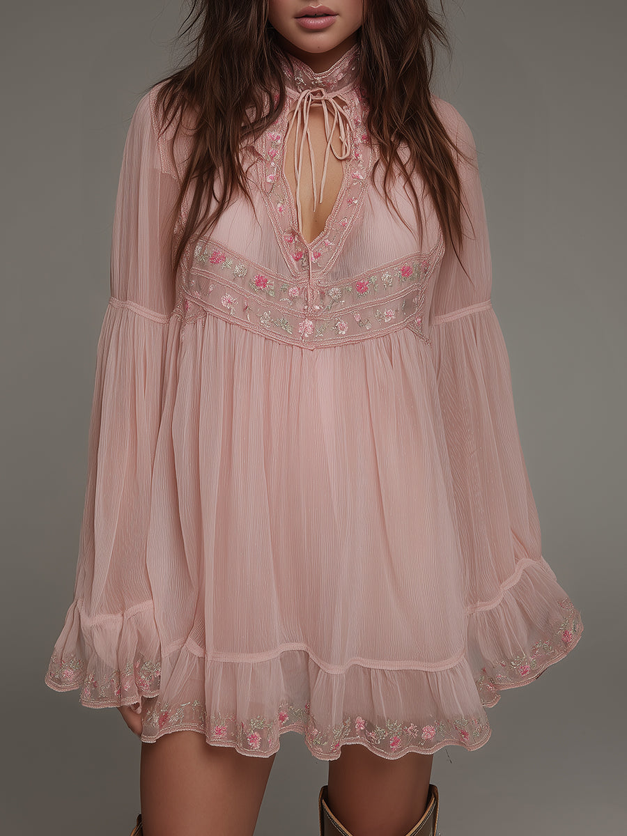 Romantic Chiffon Crinkle Embroidered Keyhole Neckline Mini Dress