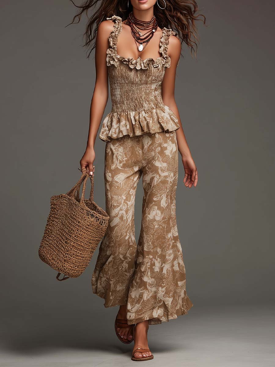Bohemian Smocked Ruffle Camisole And Floral Flare Pants Set