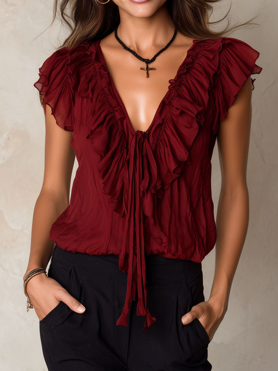 Retro Burgundy Ruffled Chiffon Flutter Sleeve Blouse