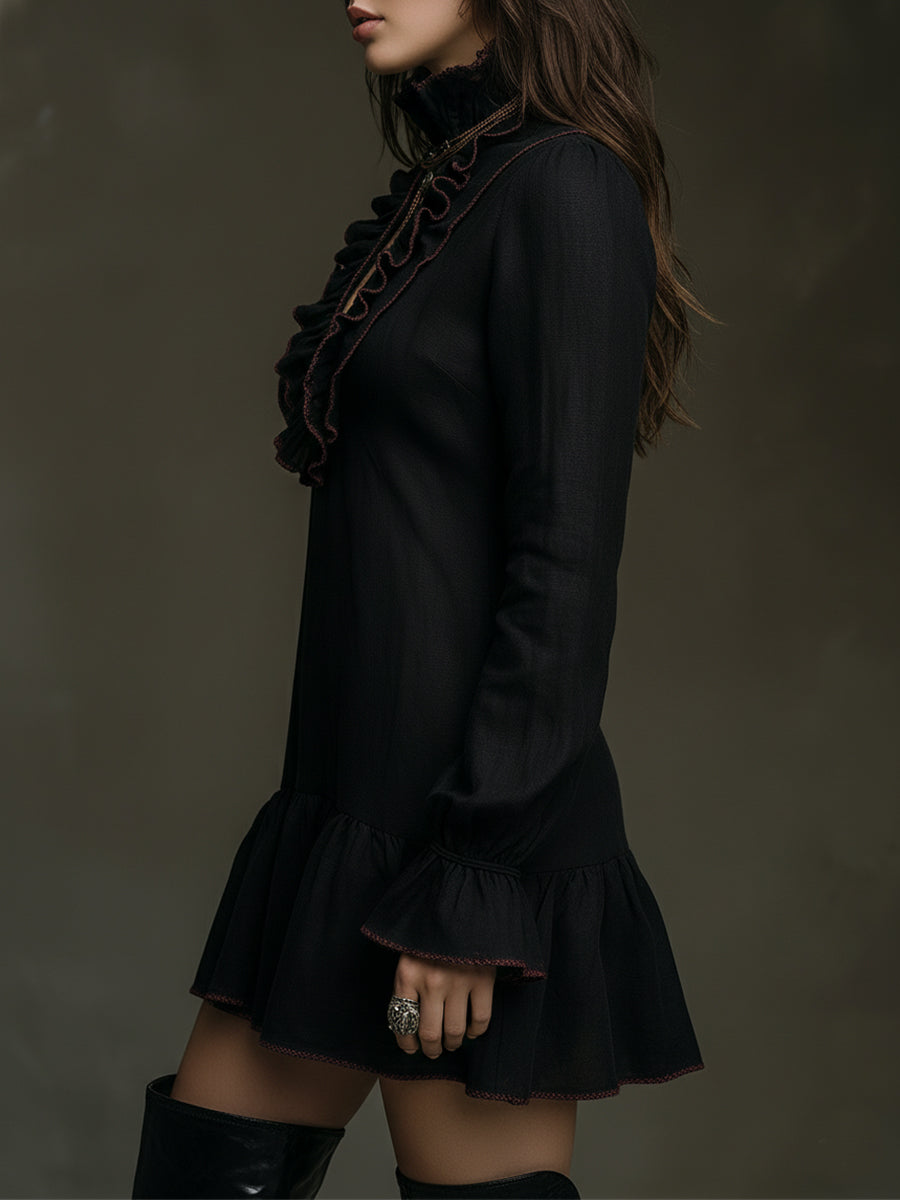 Retro Ruffled Placket Keyhole Neckline Cotton Blend Mini Dress
