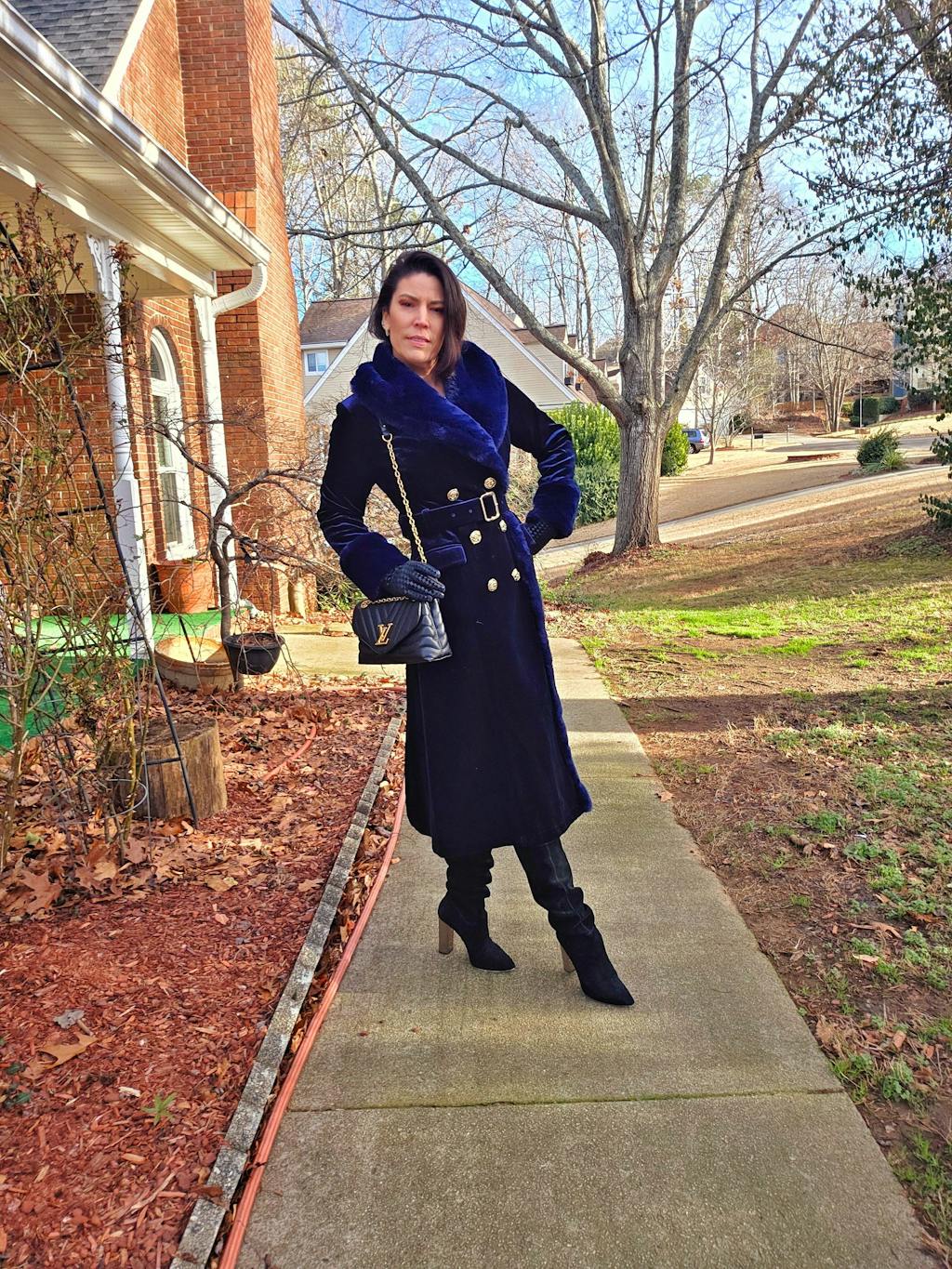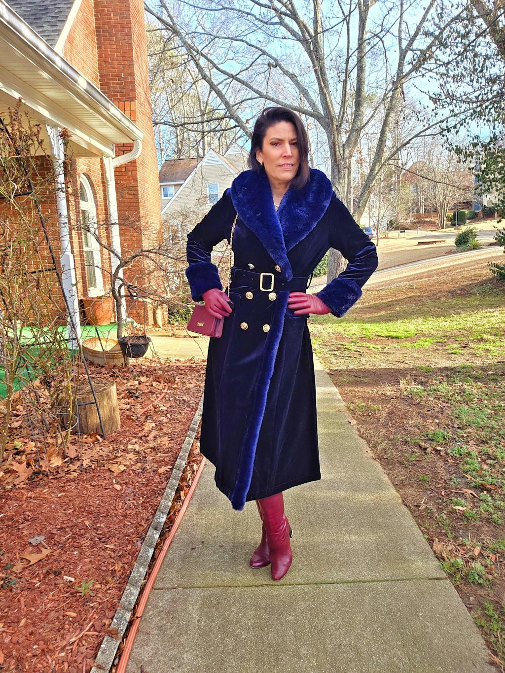 Pair this elegant velvet coat with a form-fitting dress for a night out, or layer it over a turtleneck and tailored trousers for a polished daytime look. Accent the ensemble with statement earrings or a bold handbag to enhance the sophisticated vibe.