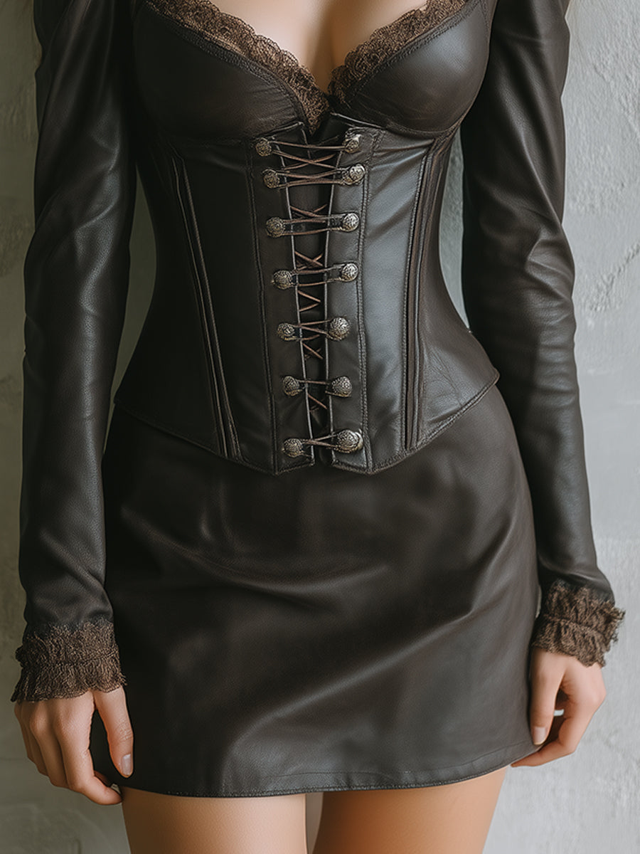 Retro Environmentally Friendly PU Detachable Girdle Lace Slim Fit Mini Dress Set