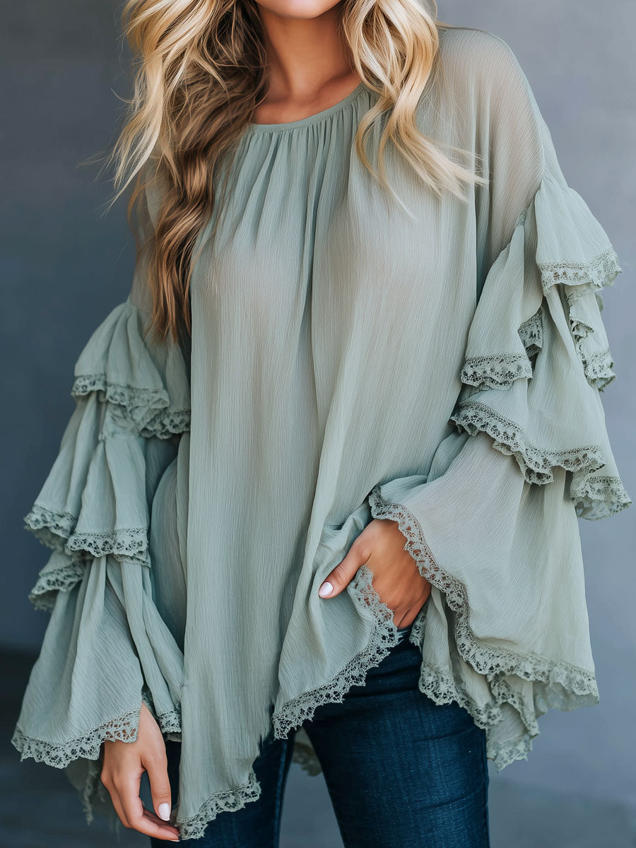 Boho Sage Green Crinkle Chiffon Tunic Top With Lace Ruffle Bell Sleeves