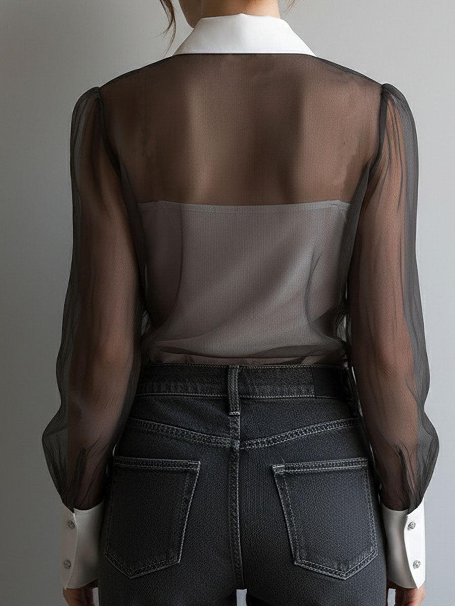 Retro Black Sheer Organza Contrast-Collar Blouse
