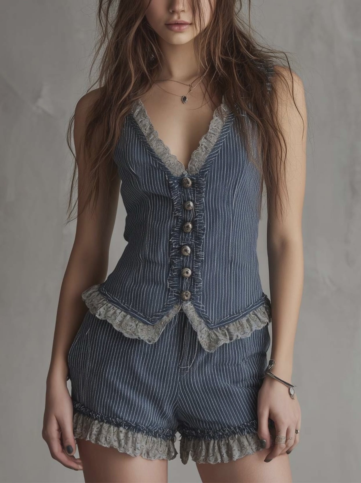 This two-piece set is crafted from pure-cotton denim with a classic pinstripe weave, combining vintage tailoring with a soft, feminine finish. The fitted vest features a deep V neckline trimmed with delicate lace and a button-front design that shapes the waist naturally. The matching high-waisted shorts echo the stripe pattern and are finished with subtle lace edging at the hem, adding lightness and contrast to the structured denim. Designed to feel breathable, flattering, and easy to style, this set delivers a relaxed boho-vintage look with refined detail.
