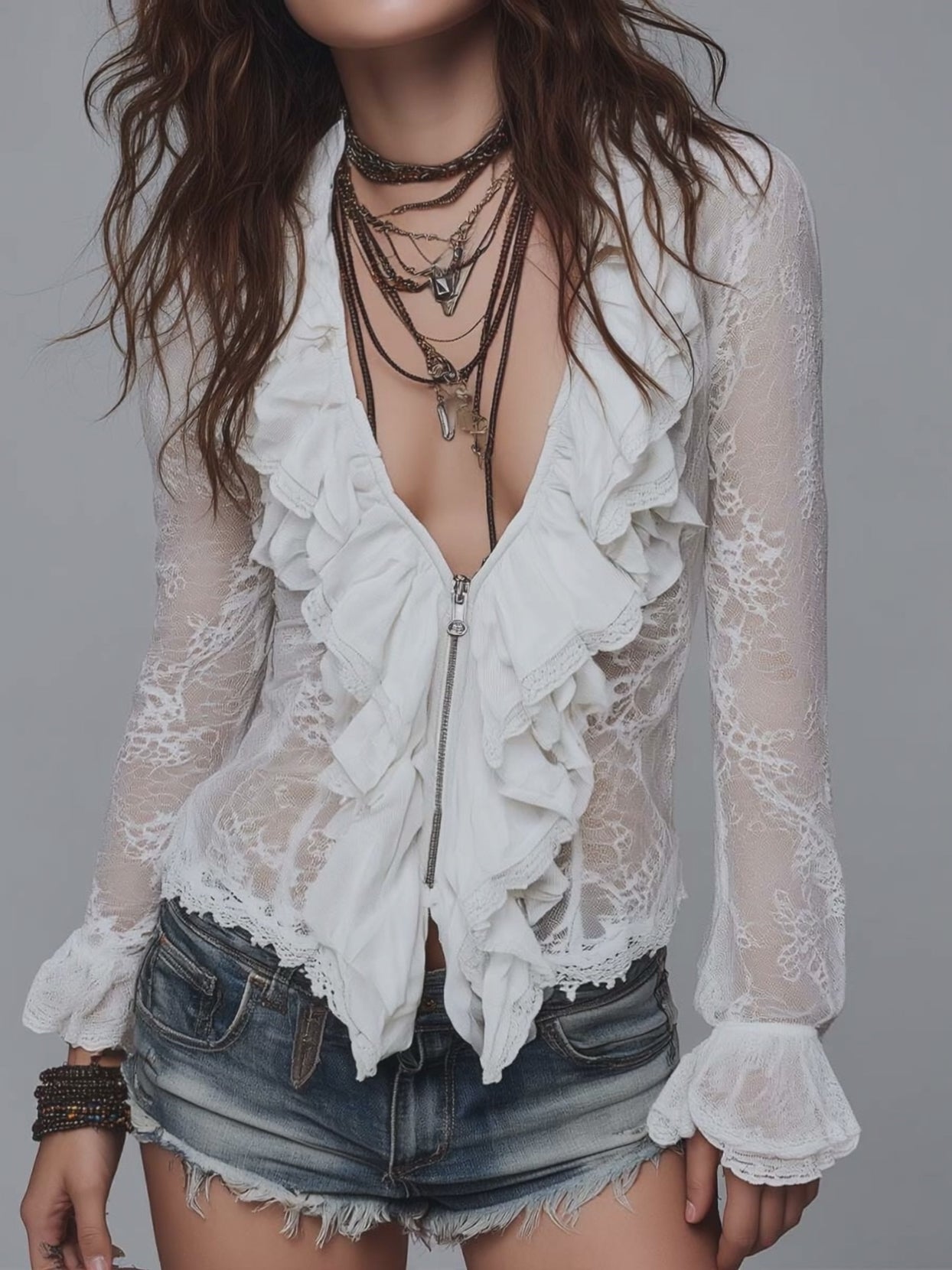 This white lace ruffle blouse captures effortless bohemian romance with a modern festival twist. Crafted in intricate floral lace, the semi-sheer texture adds lightness and movement while maintaining feminine refinement.