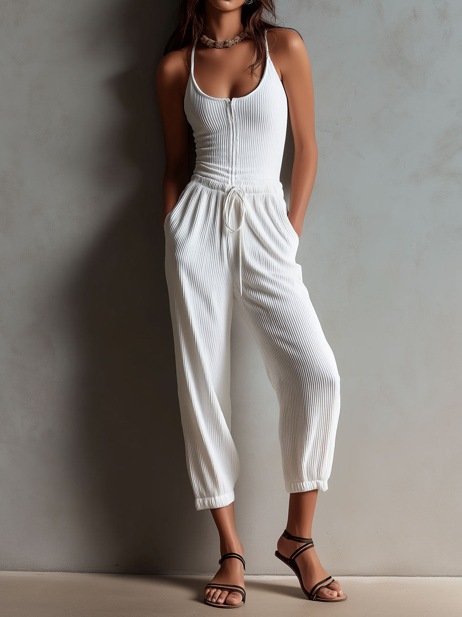 A versatile white ribbed knit jumpsuit featuring delicate spaghetti straps and an adjustable drawstring waist. This one-piece combines a soft, textured knit bodice with a comfortable, easy-to-wear silhouette—ideal for casual days, travel, or relaxed weekend outings. The minimalist design and neutral white shade make it a wardrobe staple that transitions effortlessly from day to night.