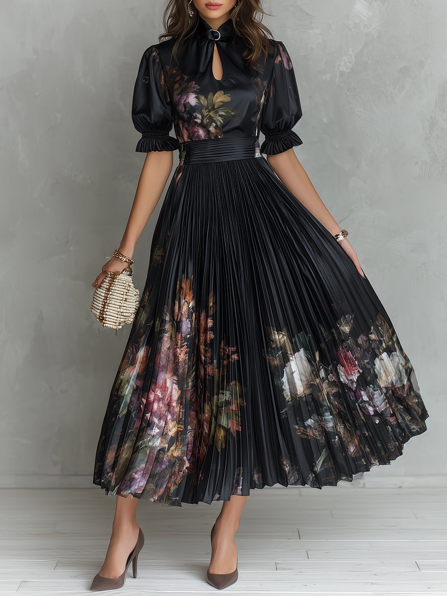 Retro Floral Print Keyhole Collar Pleated Satin Maxi Dress