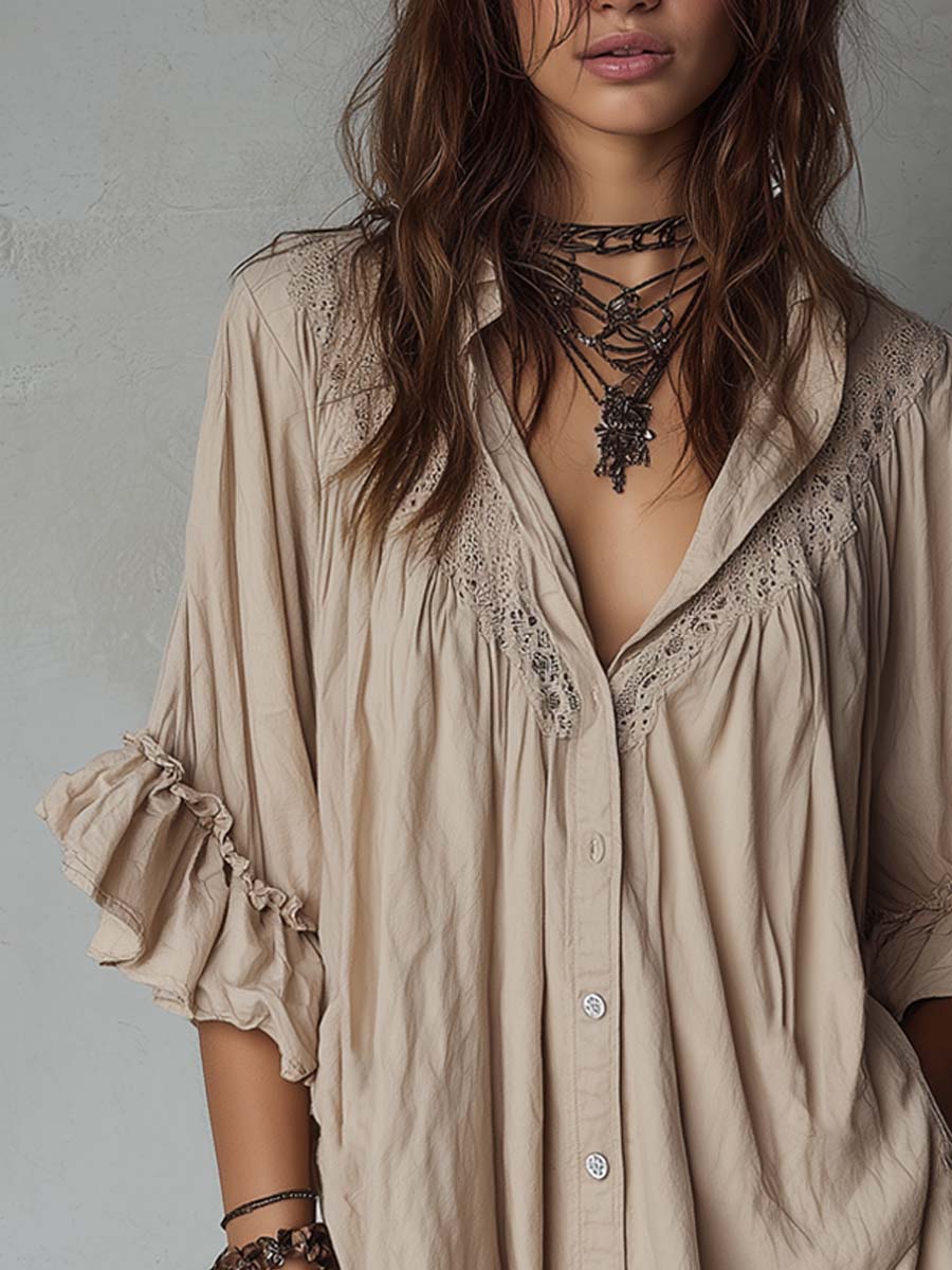 Retro Ruffle Cuffs Cotton Linen Mini Dress