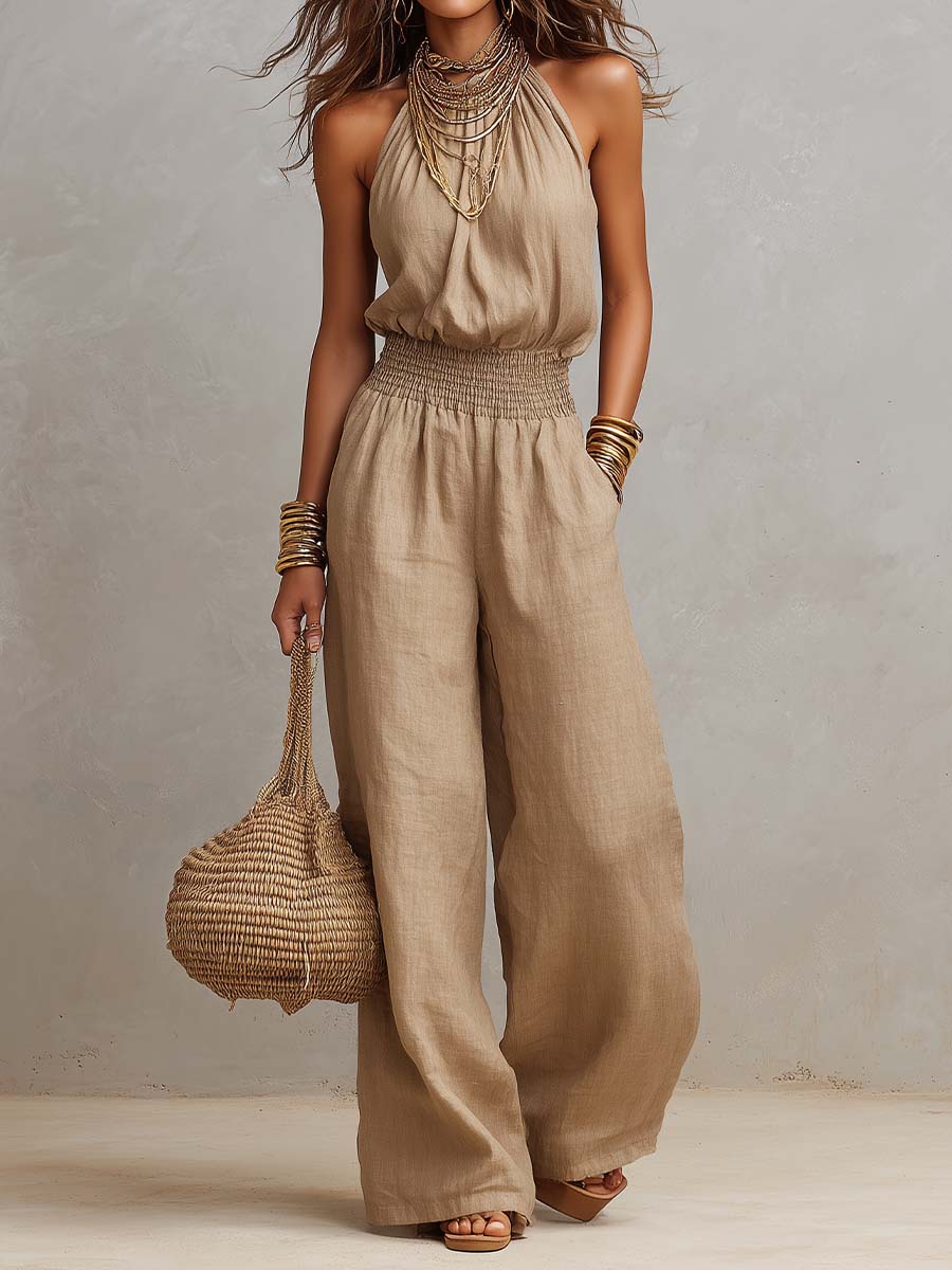 Crafted from a lightweight, breathable cotton-linen blend, this halter-neck jumpsuit is the ultimate warm-weather essential. It features a flowy halter top with a gathered bust, a smocked elastic waistband to cinch your silhouette, and wide-leg pants with side pockets for practicality. The natural tan hue and textured linen fabric evoke a laid-back, bohemian vibe, perfect for embracing the sun-drenched days of spring and summer in the US market.