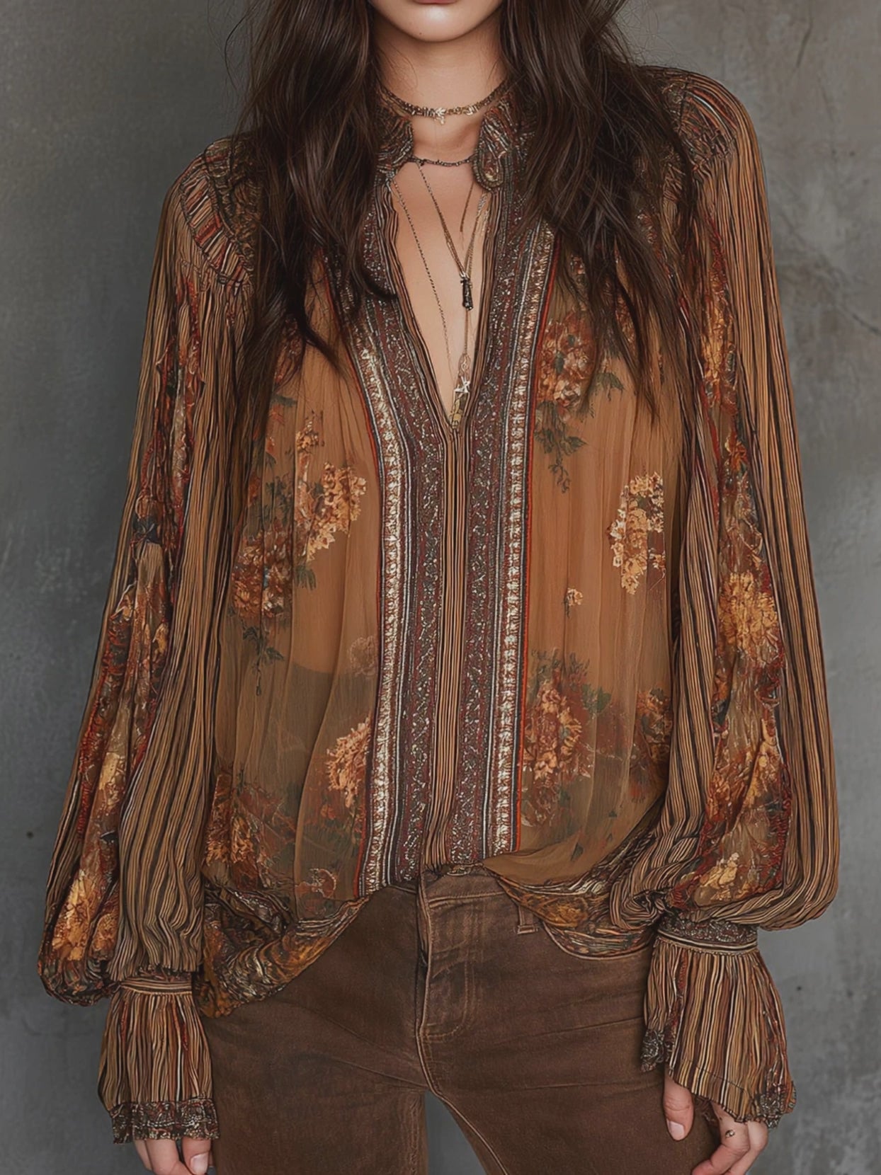 Vintage Boho Sheer Floral Blouse With Billowy Sleeves