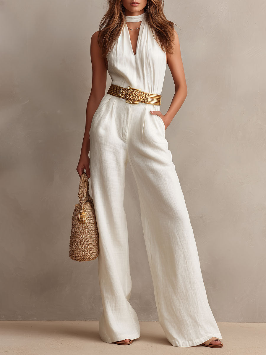 Vintage Boho White Halter Wide-Leg One Piece Jumpsuit