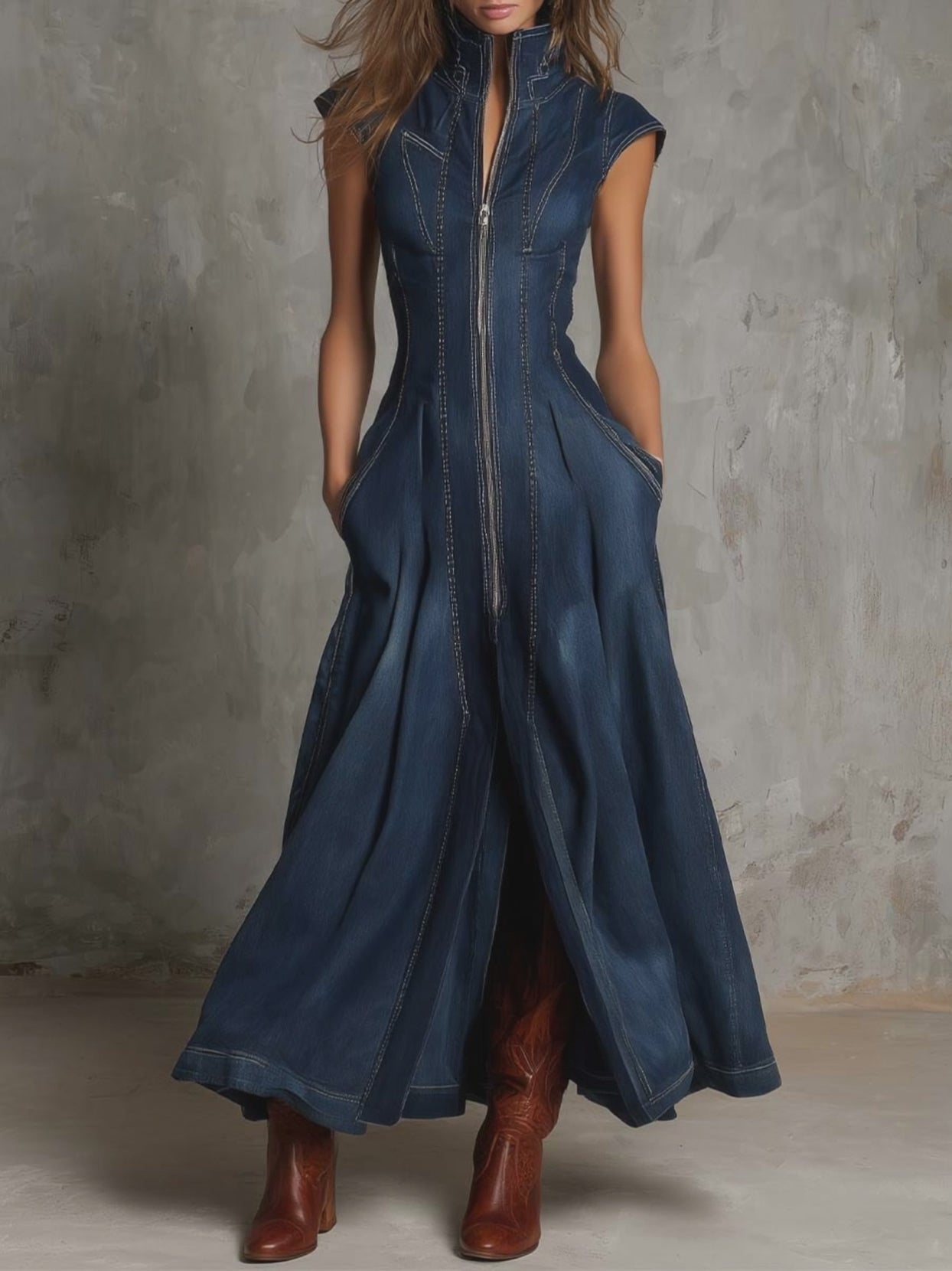 Designed with a strong vintage soul and a modern, sculpted silhouette, this sleeveless denim maxi dress blends boho femininity with refined elegance. Crafted from pure-cotton denim, it features a clean zip-front design and subtle seam detailing that naturally contours the body while allowing comfortable movement.